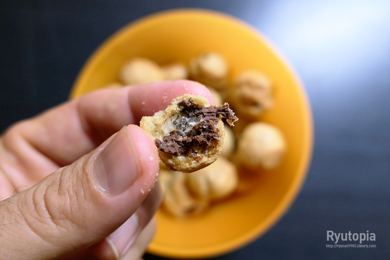 일단 초코를 감싸고 있는 슈의 식감은 홈런볼보다 좀 더 단단하고 바삭바삭한 편. 입안에서 사르르 녹는 느낌은 없습니다.