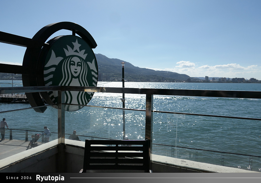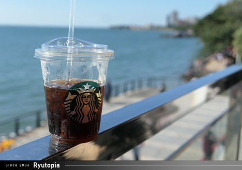 스타벅스의 둥근 간판을 배경삼아 단수이 강을 한 컷.