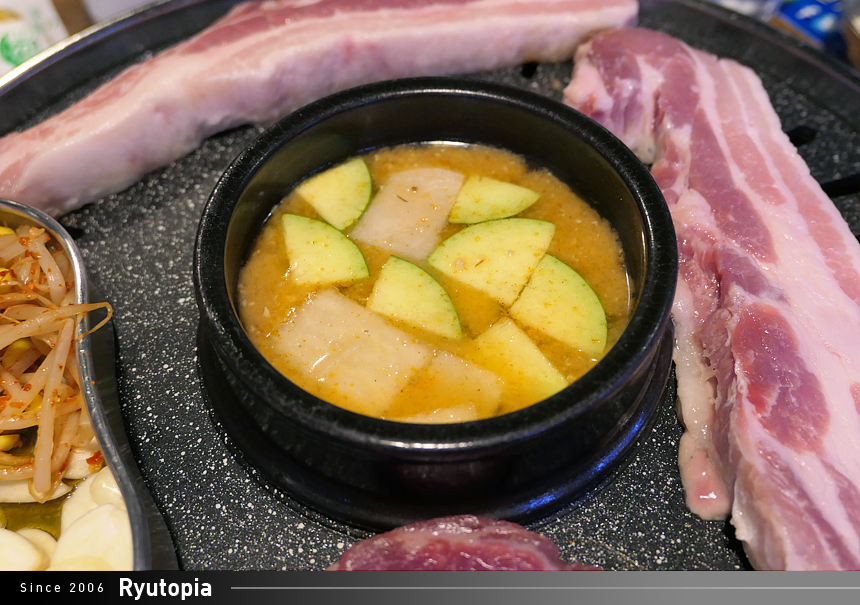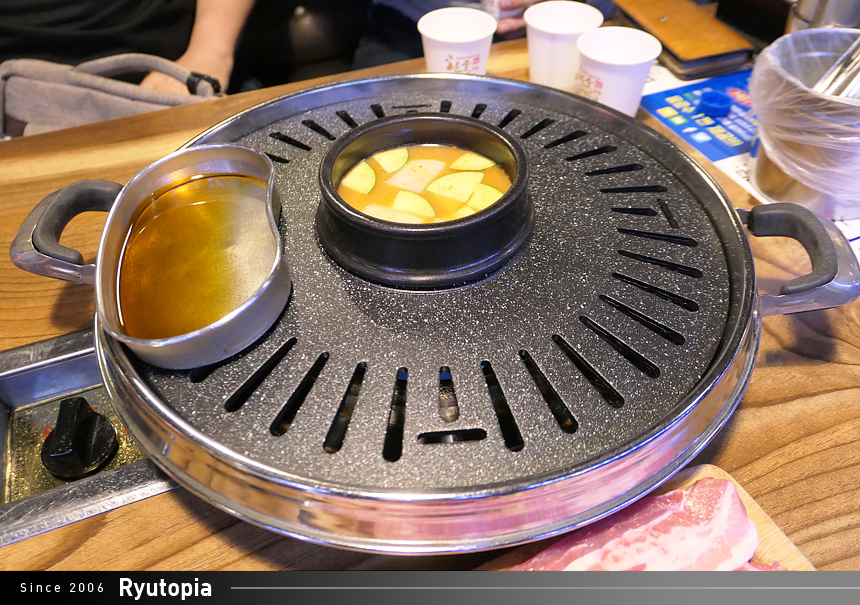 기본 불판 세팅. 불판 가운데 된장찌개가 들어있는 뚝배기, 그리고 왼편엔 소스가 들어있는 찬합이 함께 올라갑니다.