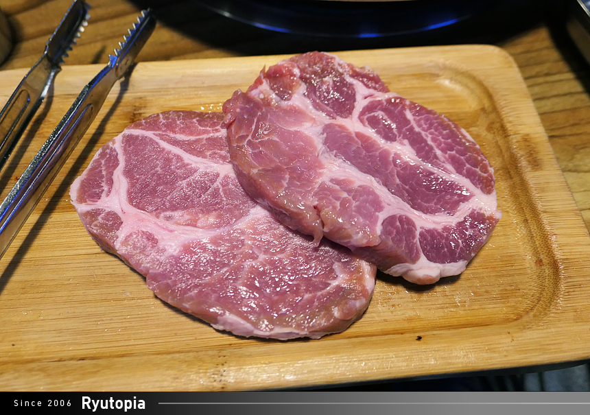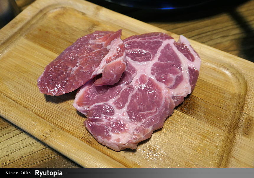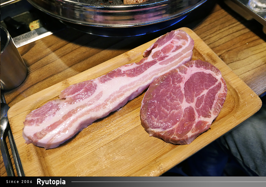 나무 도마에 고기가 담겨 나오는데요, 삼겹살과 목살, 두 종류의 고기가 준비되어 있습니다.