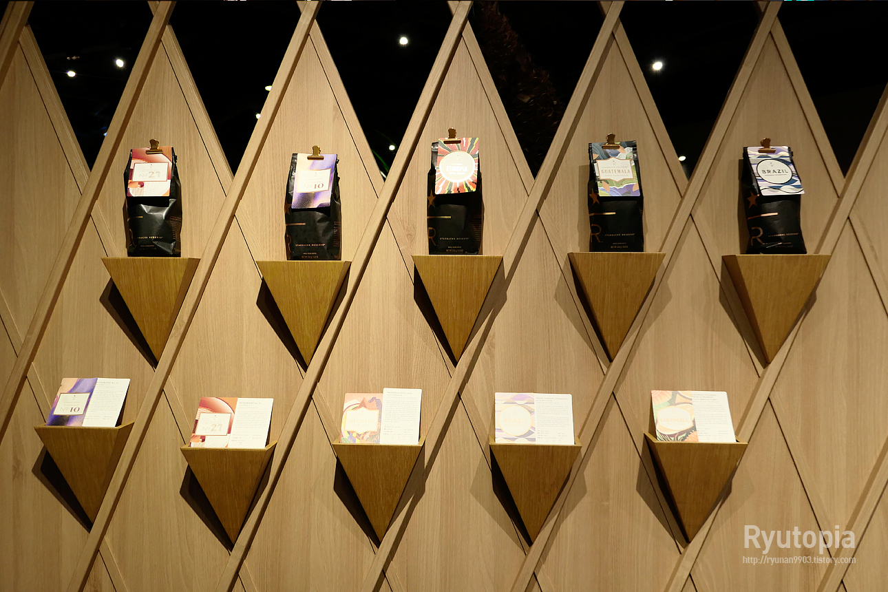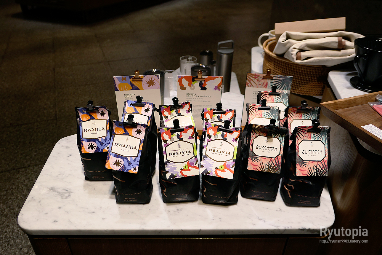 벽면에 진열되어 있는 스타벅스 리저브 원두.