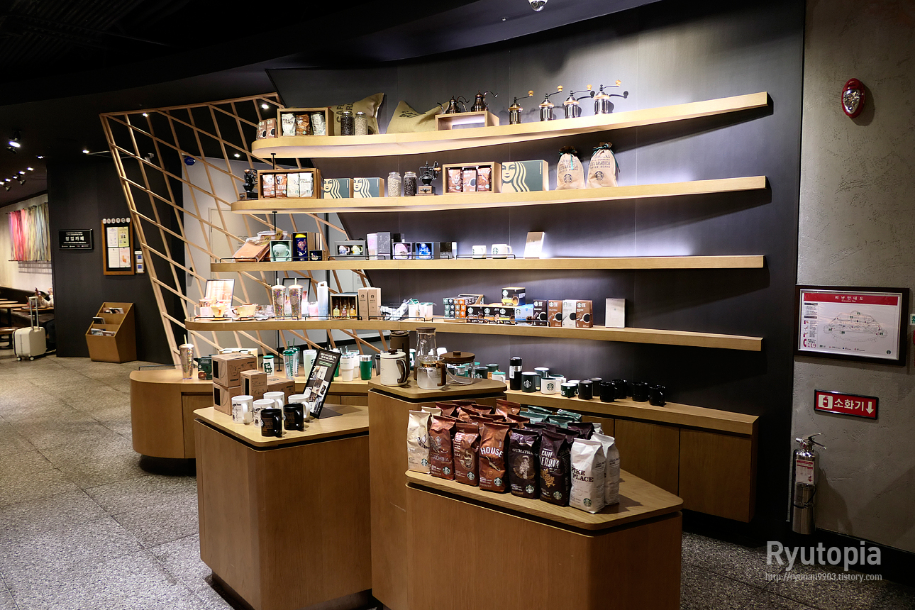 스타벅스 원두를 비롯하여 텀블러, 머그잔 등 각종 상품을 판매하는 진열대.