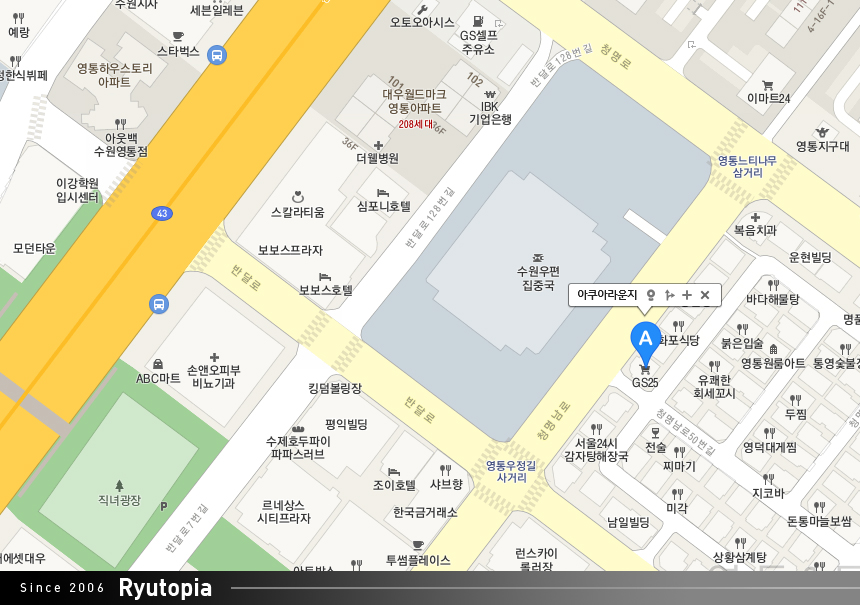 ※ 아쿠아라운지 찾아가는 길 : 영통역 수원우편집중국 뒷쪽 영통우정길사거리 근방 GS25 건물