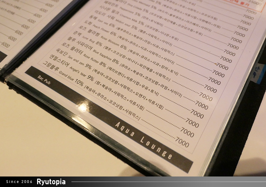 다양한 종류의 칵테일 가격은 대부분 6~7천원선에 구성되어 있습니다.
