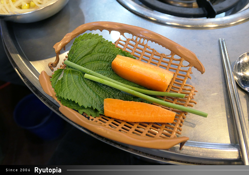 쌈채소로는 깻잎 한 종류가 나오고 마늘쫑, 그리고 생당근이 함께 담겨나옵니다.