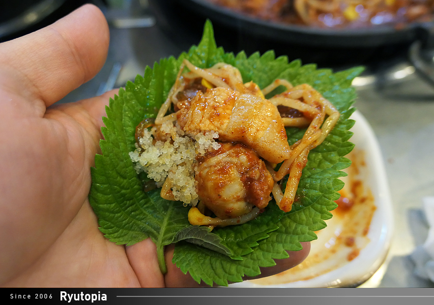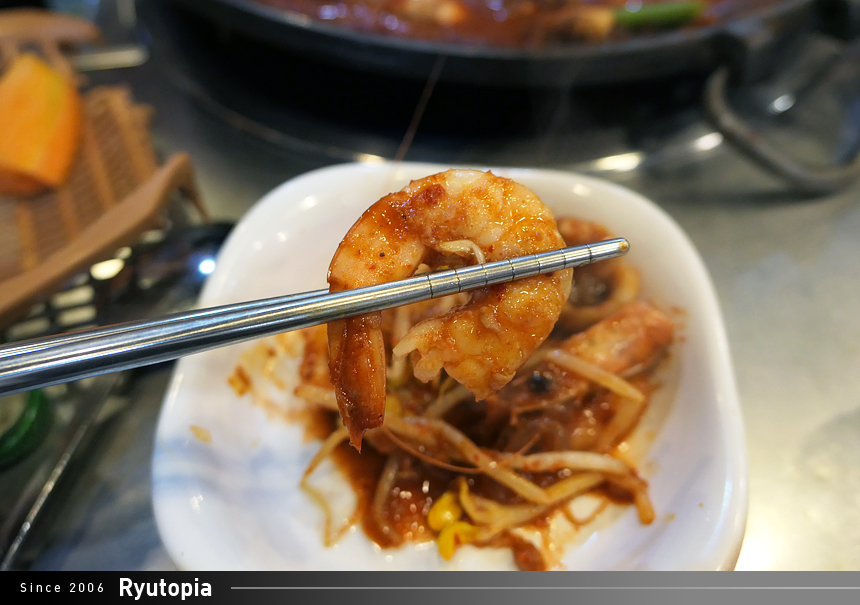 쭈꾸미를 먼저 집어먹은 뒤 조금 있다가 삼겹살, 그리고 새우 순으로 즐기면 됩니다.