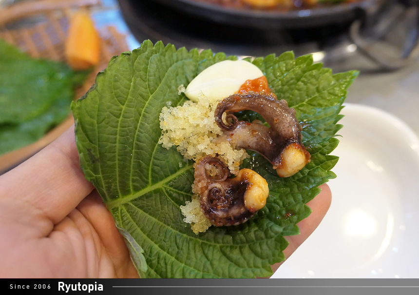 깻잎 위에 쭈꾸미와 날치알, 그리고 슬라이스한 마늘, 여기에 무쌈까지 더하면 완벽한 한 쌈 완성.