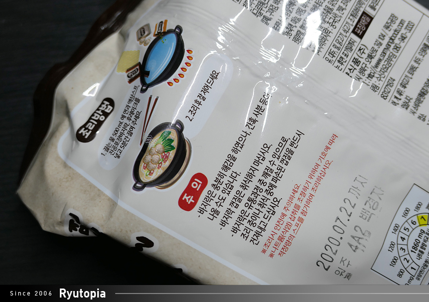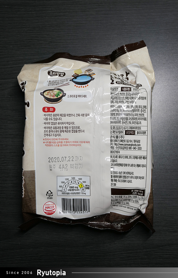 제품 포장 뒷면 오른편의 원재료 및 함량, 그리고 영양성분표입니다. 한 봉지(133g)당 열량은 495kcal군요.