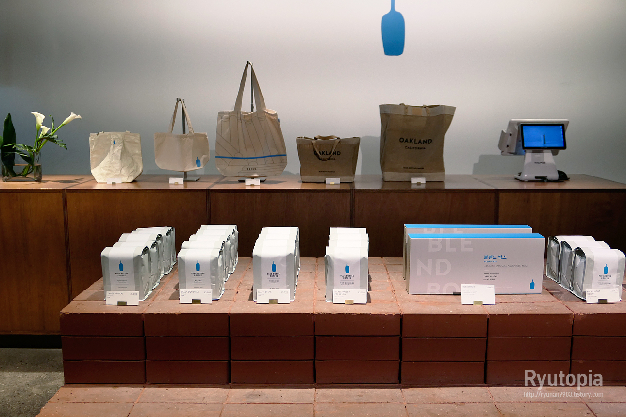 각종 블루보틀 관련 상품들이 진열되어 있는 매대.