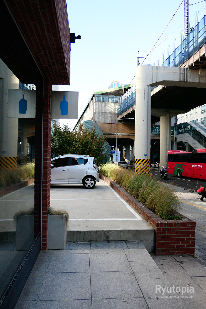 사진에 보이는 블루보틀 간판 뒤의 고가역사는 뚝섬역입니다. 성수역에서 내려 블루보틀 찾으면 낭패볼 수 있으니 조심.
