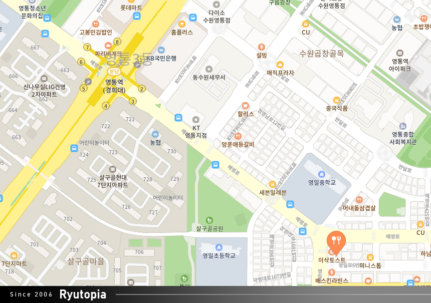 ※ 키와마루아지 영통(경희대)점 찾아가는 길 : 수도권 전철 분당선 영통역 3번출구 하차 후 쭉 직진, 영일중학교 맞은편