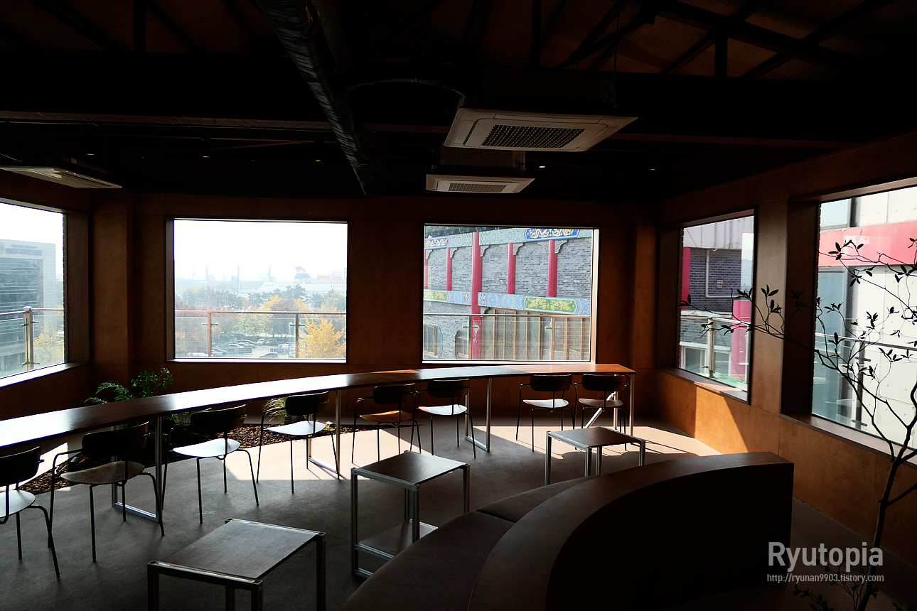 이렇게 통유리로 탁 트여 있는 또다른 공간이 2층에 마련되어 있어 여기 앉아 창 밖 풍경 보며 커피를 즐길 수 있습니다.