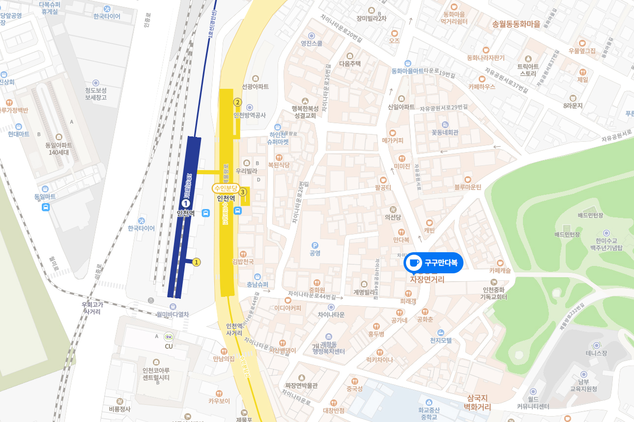 ※ 구구만다복 찾아가는 길 : 수도권 전철 1호선, 수인분당선 인천역 하차, 북성동 원조 자장면거리 내 황제의 계단 맞은편