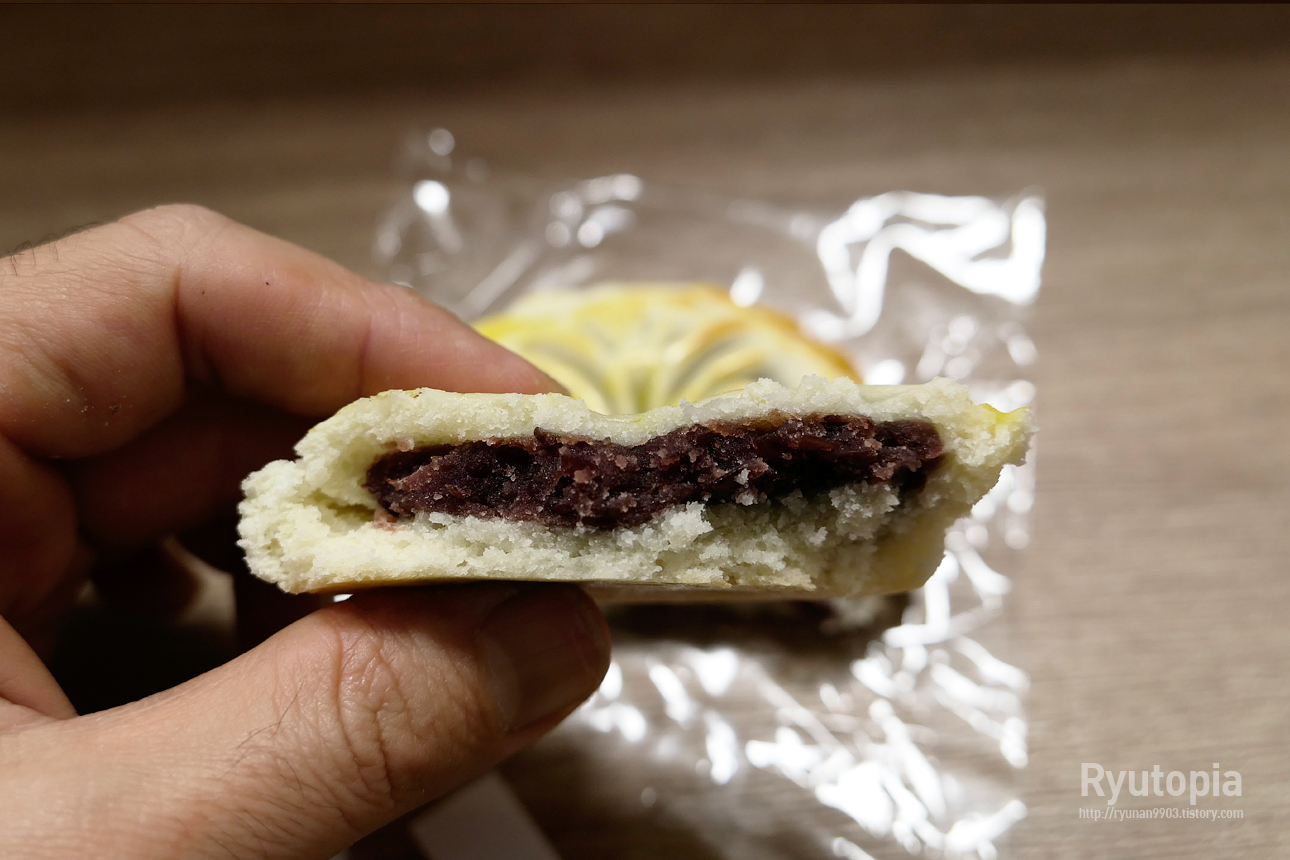 잘 부스러지는 부드러운 케이크 속에는 곱게 갈은 단팥이 가득 들어있습니다.