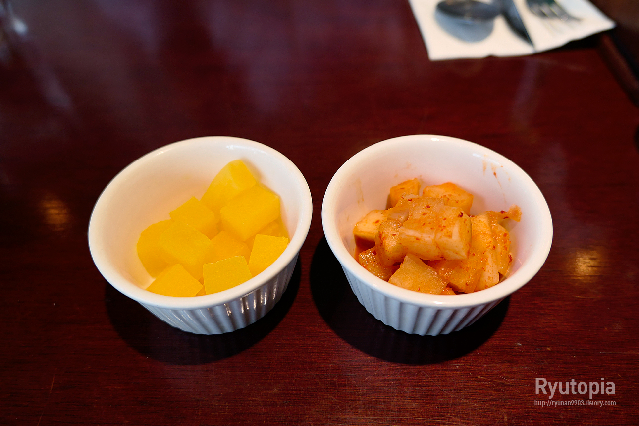 기본 반찬으로는 깍두기, 그리고 깍두기와 동일한 크기로 썬 단무지 두 가지가 제공됩니다.