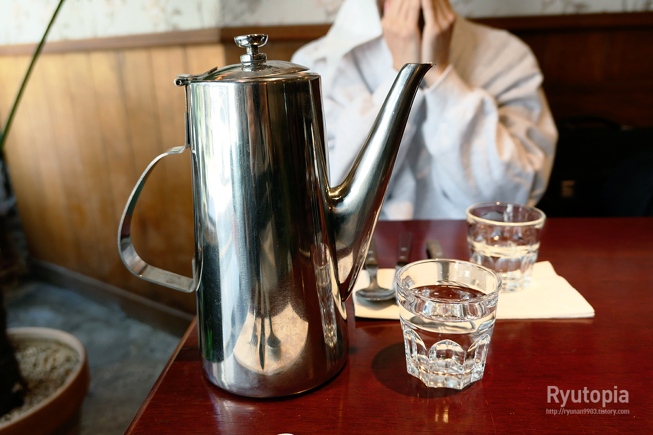 물병도 일반적인 물병이 아닌 매장 분위기와 어울리는 스테인레스 전용 주전자를 사용하고 있군요.