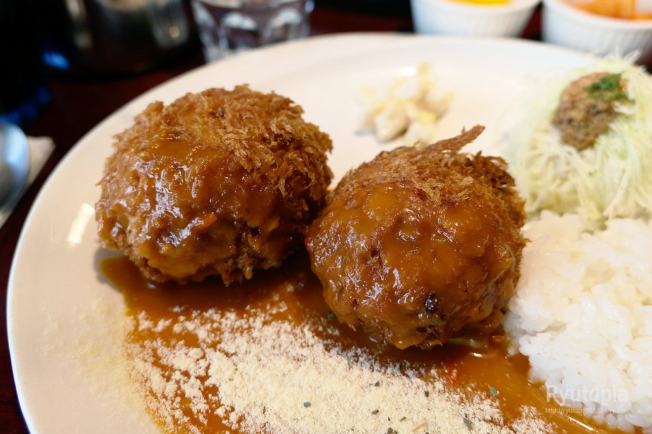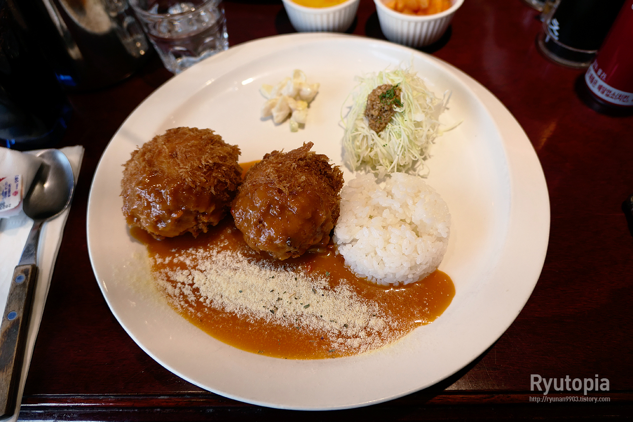 납작한 돈까스가 아닌 볼카츠처럼 둥글둥글하게 튀겨진 두 덩어리의 돈까스가