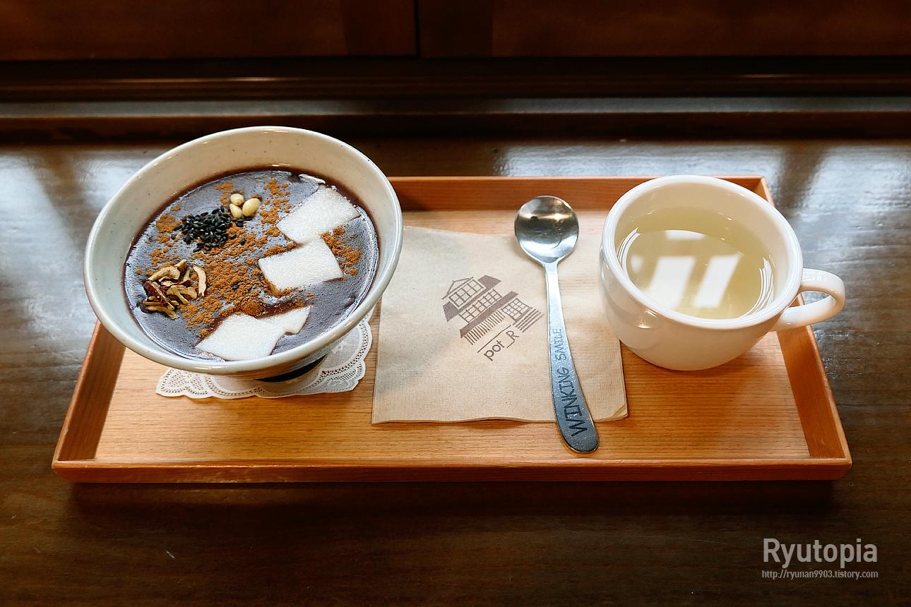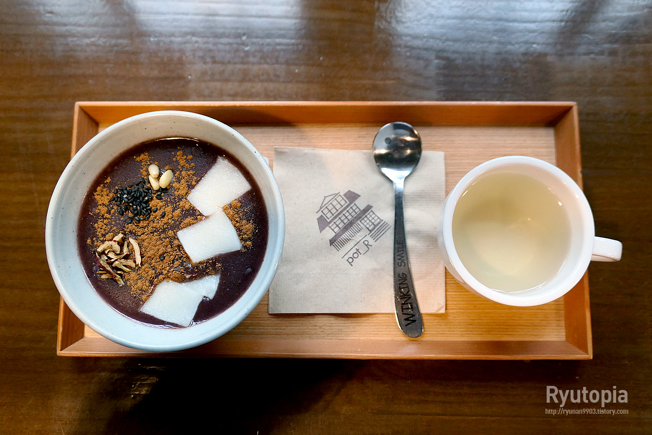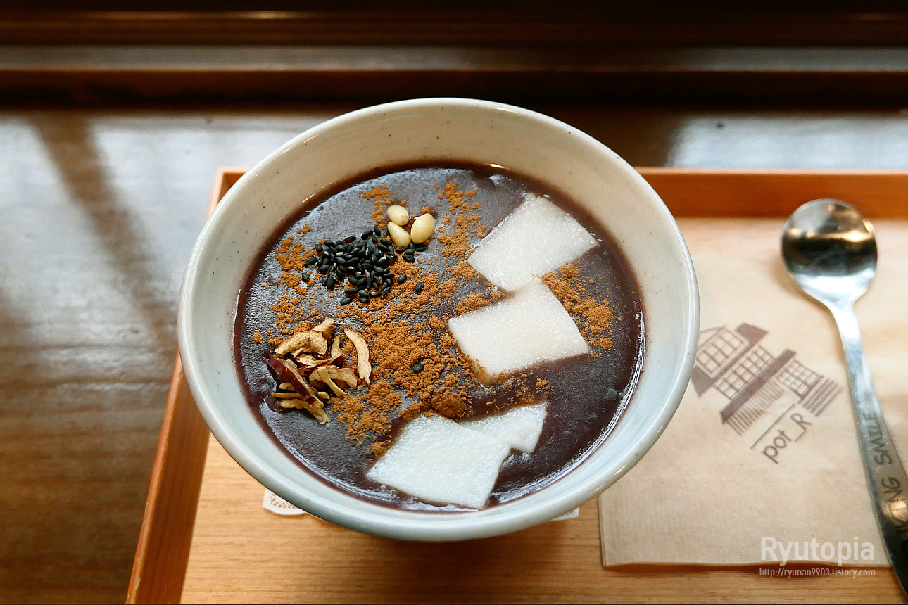 카페 팟알의 시그니처 메뉴 중 하나인 단팥죽. 나가사키 카스테라, 팥빙수와 함께 이 카페의 인기 메뉴 중 하나.