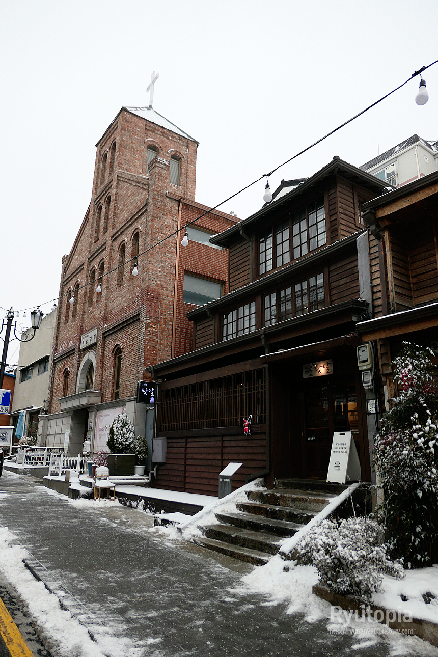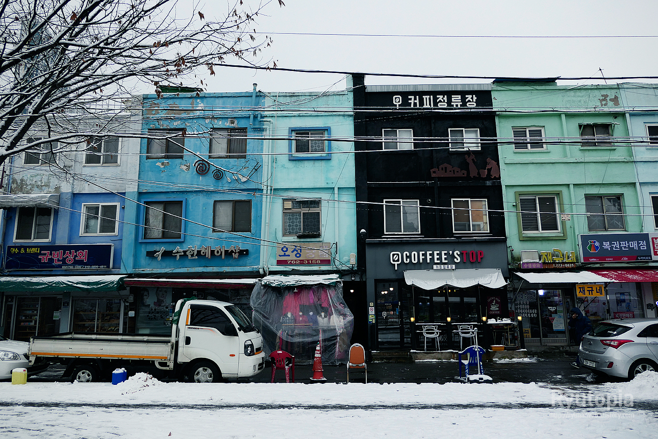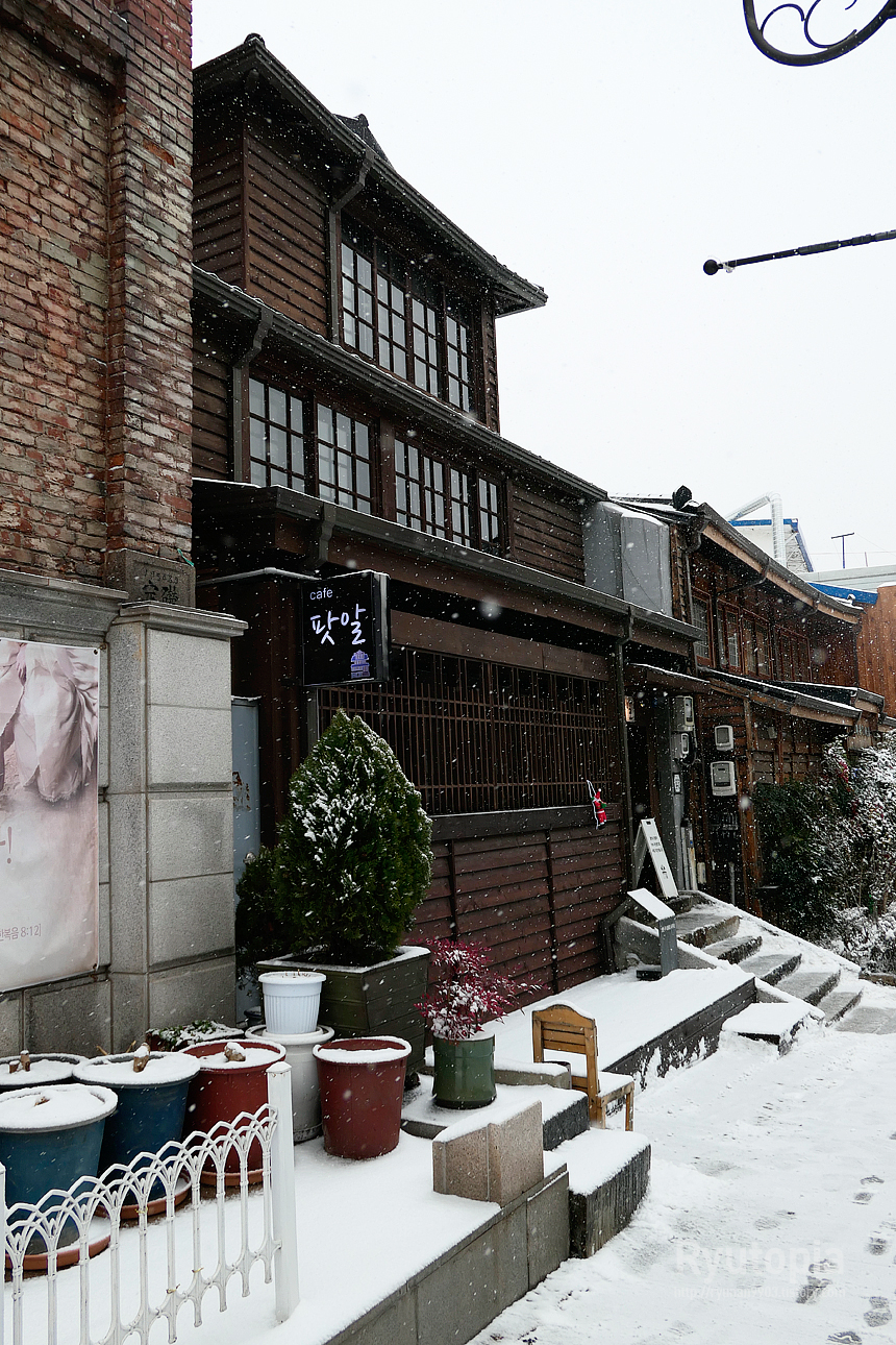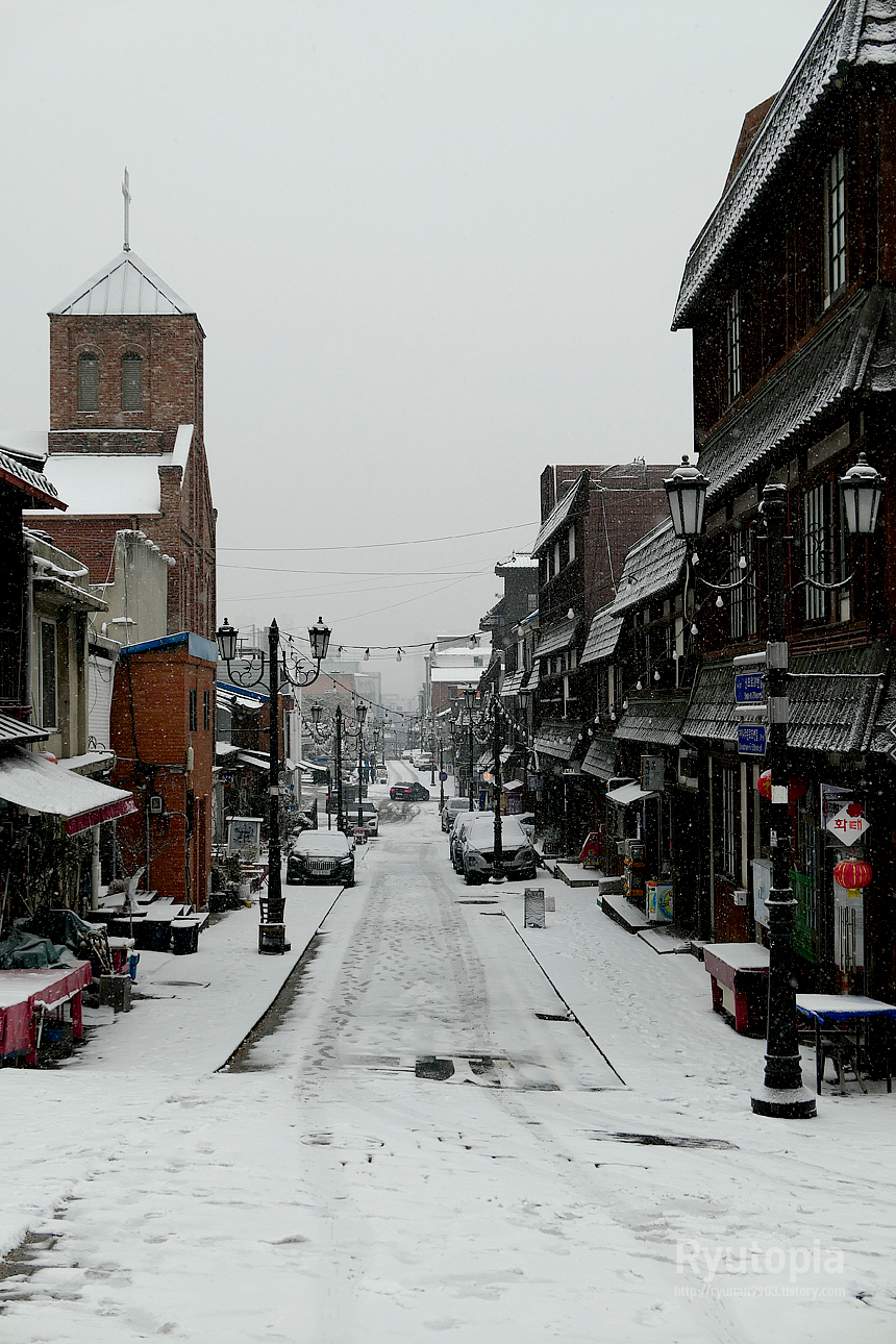 평소에도 주말에나 반짝 사람이 많지 평일에는 한산한 거리인데, 눈이 내리니 사람의 인기척이 더 안 느껴지던...