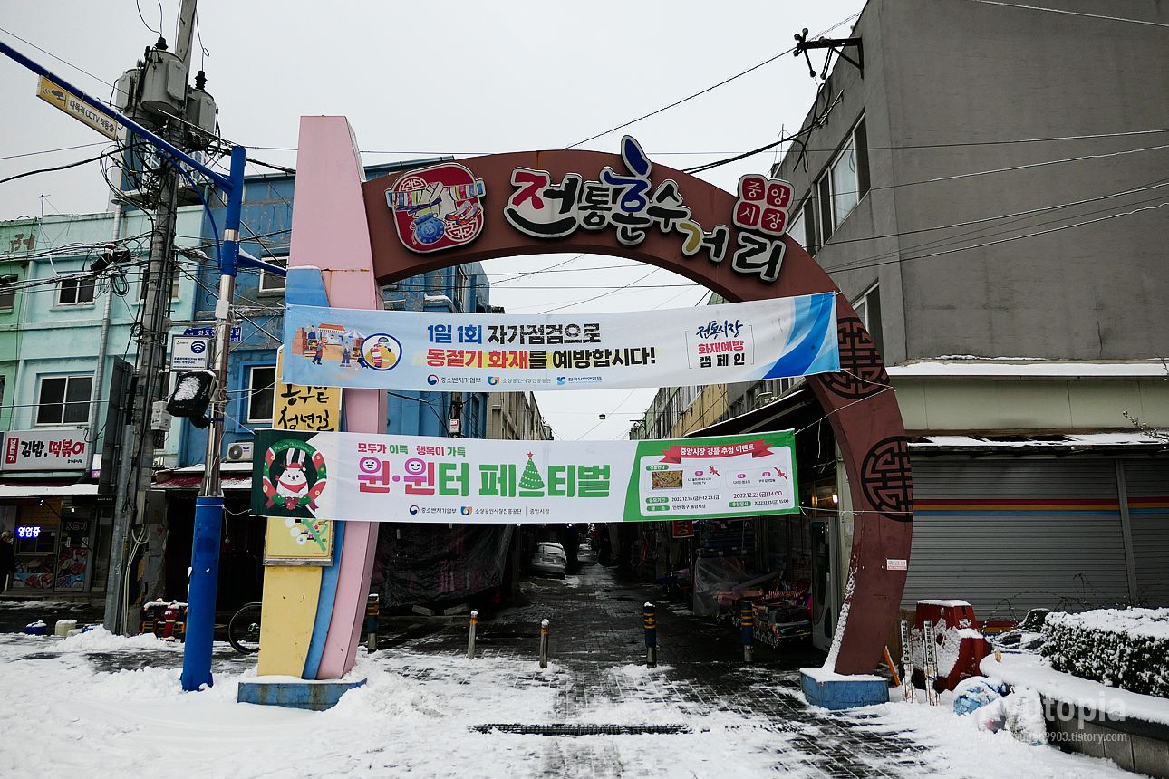 하얗게 뒤덮인 신포동 신포중앙시장으로 넘어가는 길목의 '인천 근대개항거리'