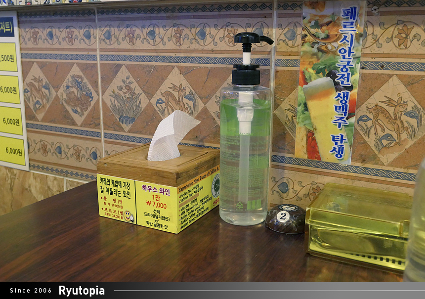 코로나19의 영향으로 각 테이블마다 손세정제가 전부 비치되어 있습니다.