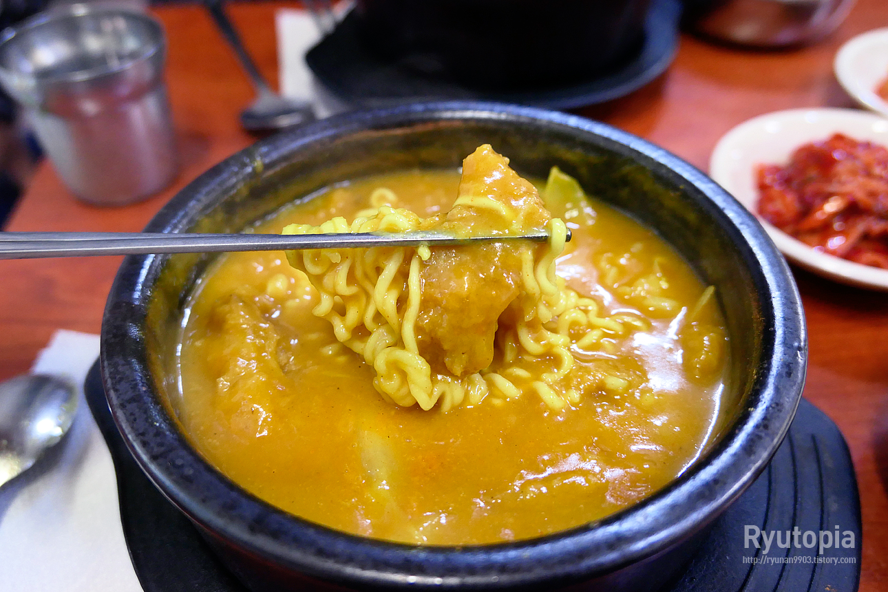 카레가 펄펄 끓는 뚝배기 안에 라면사리, 그리고 돈까스가 들어있어요.