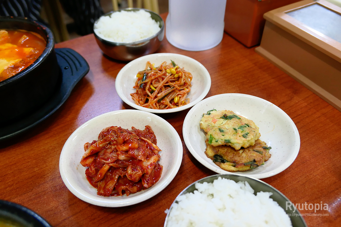 기본 반찬으로는 배추김치와 콩나물무침, 그리고 조그마한 전 세 가지가 나오더라고요.