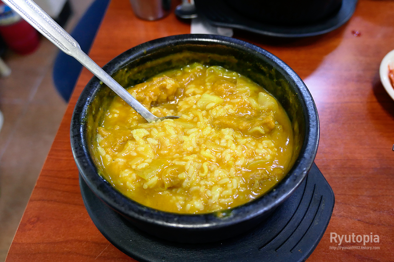 순대국이라든가 뼈해장국 같은 음식이 들어있을 법한 뚝배기에 카레가 펄펄 끓는 상태로 제공되어 나옵니다.