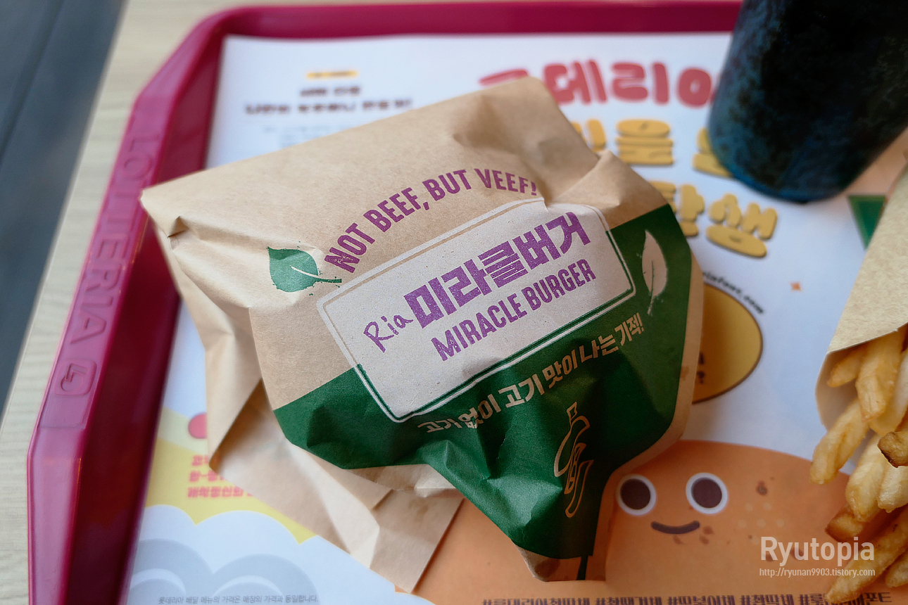 롯데리아에서 꽤 재미있는 햄버거 신상품이 나왔습니다. 햄버거 이름은 '리아 미라클 버거' 포장지에 프린팅되어 있는 'NOT BEF, BUT VEEF' 처럼 이 버거는 한국 메이저 패스트푸드 최초의 '동물성 재