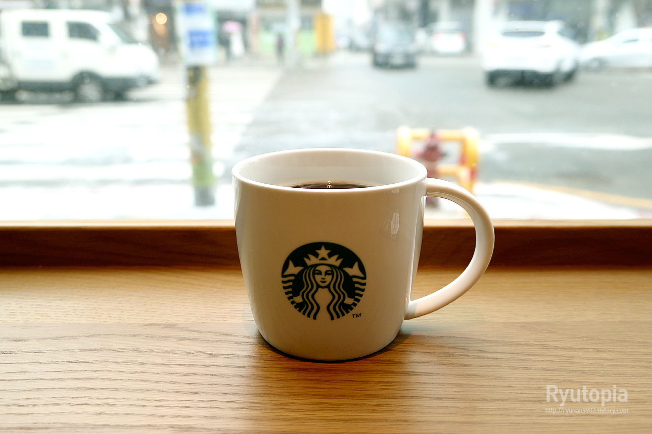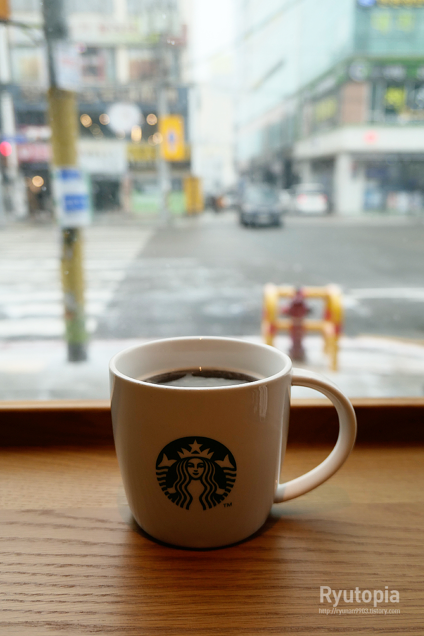 사실 풀빵 먹으러 가기 전, 가게 문 여는 거 기다리려고 앉아있었던 거긴 하지만... 눈 바라보며 마시는 커피 좋네요.
