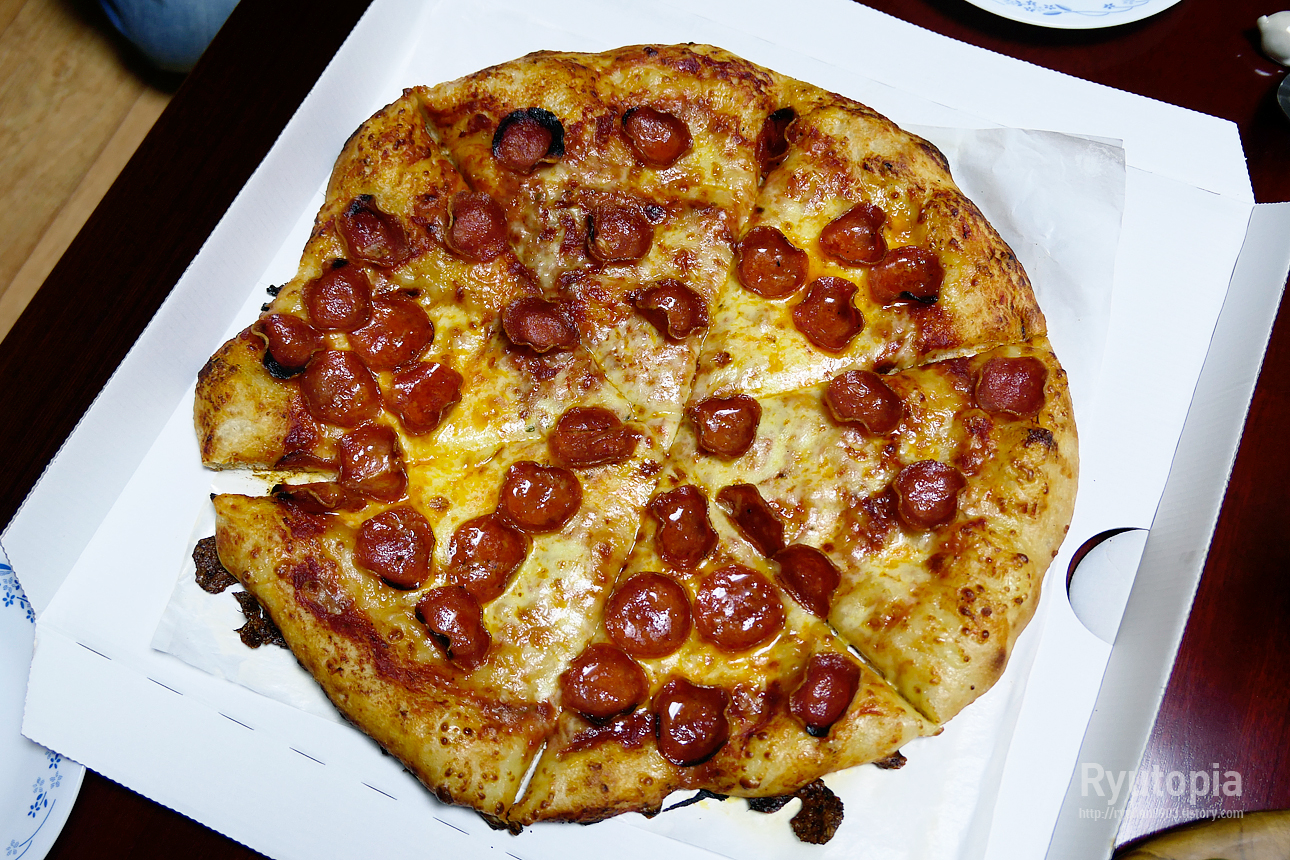 피자 구성은 아주 단순합니다. 다른 프랜차이즈 피자 전문점의 페퍼로니 피자와 동일하게 도우 위에 치즈, 그리고