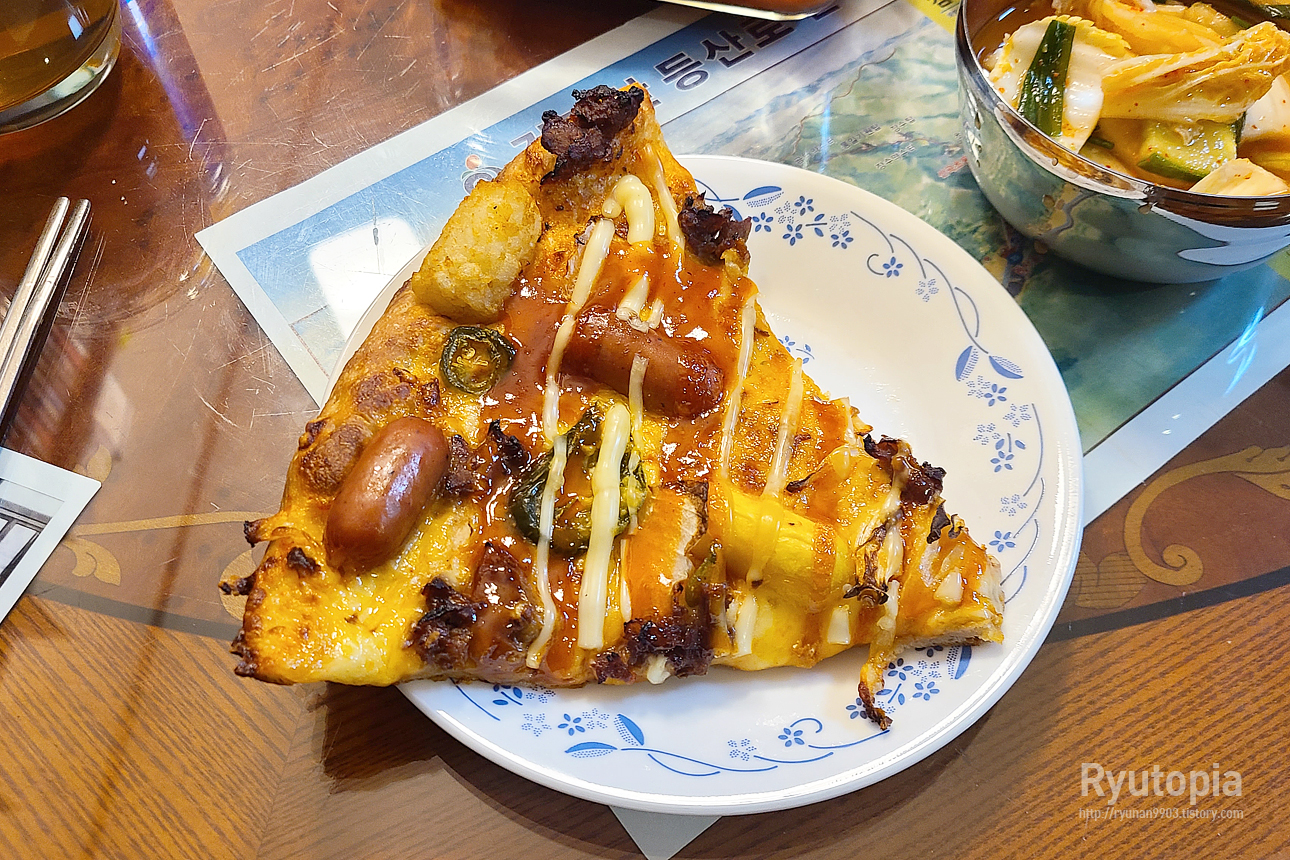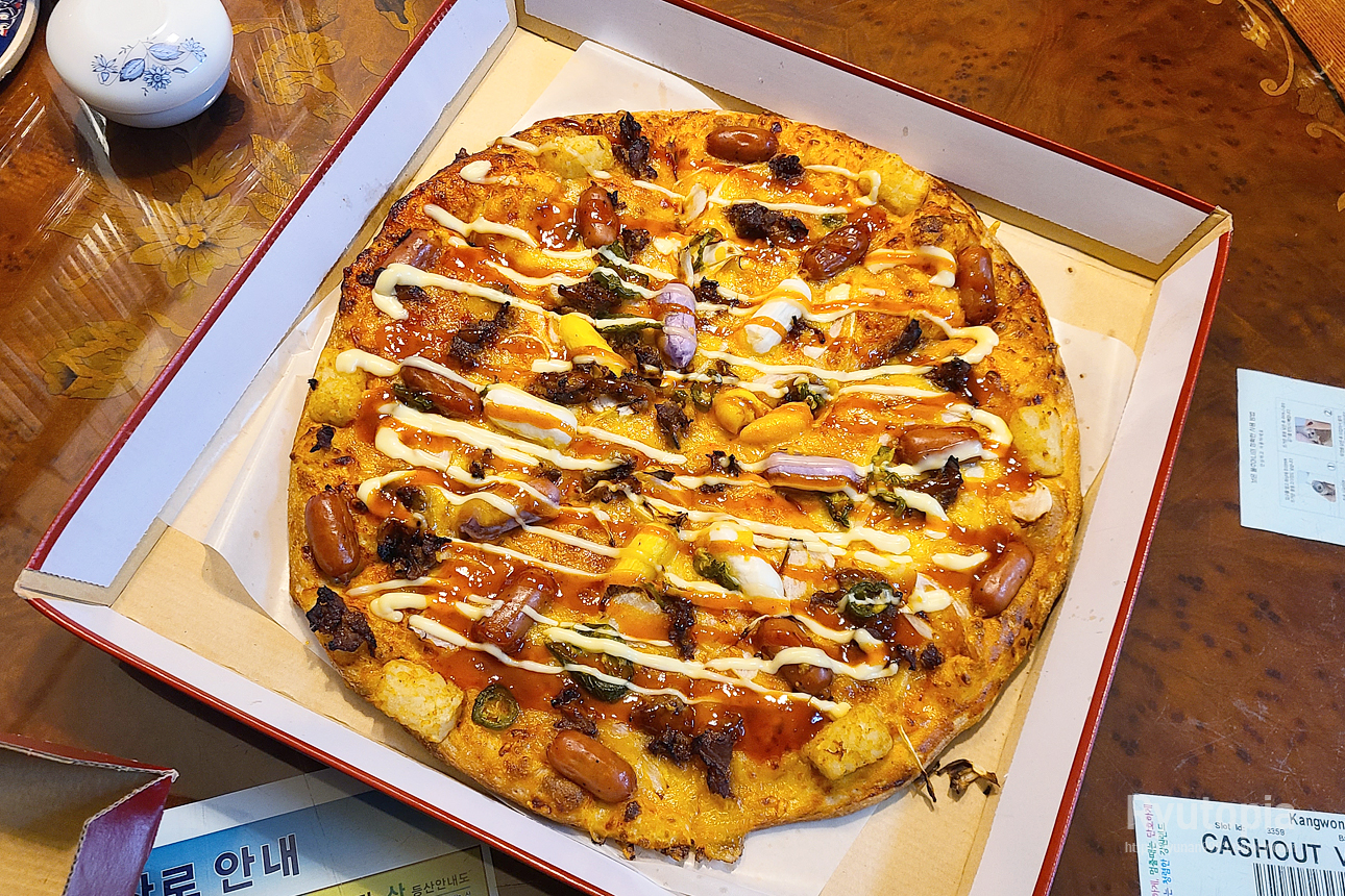 피자 폭은 33cm로 일반적인 라지 피자 사이즈. 위에 비엔나 소시지와 치즈떡, 쇠고기 토핑이 다채롭게 올라가 있더군요.