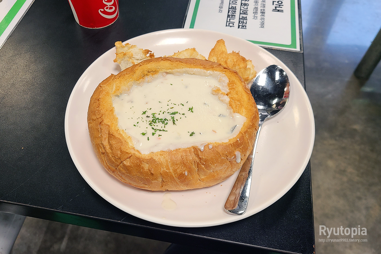 빠네라는 이름답게 둥근 빵으로 만든 접시 안에 전복 수프가 담겨있어 수프와 빵을 함께 즐길 수 있는 식사용 메뉴.