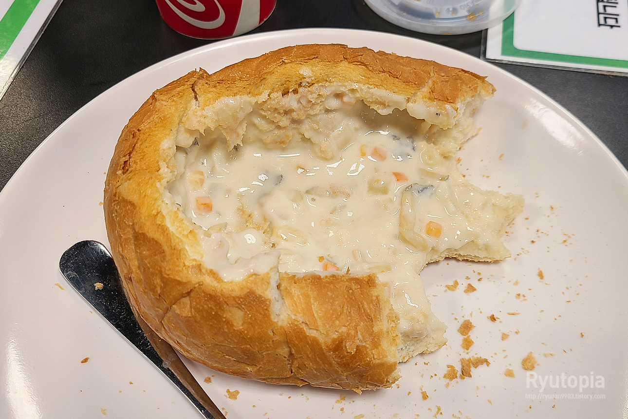이건 수프 국물이 빵에 잘 스며들어 이 큼직한 빵까지 뻑뻑하지 않고 부드럽고 촉촉하게 먹을 수 있다는 게 좋았습니다.