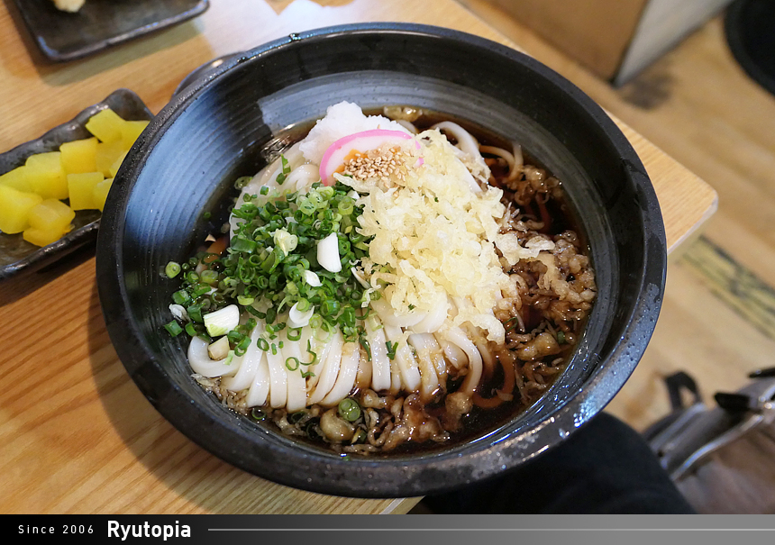 우동과 별개로 고명으로 들어간 파라든가 튀김가루 등의 양도 넉넉해서 좀 더 진하고 풍부하게 즐길 수 있는 맛.