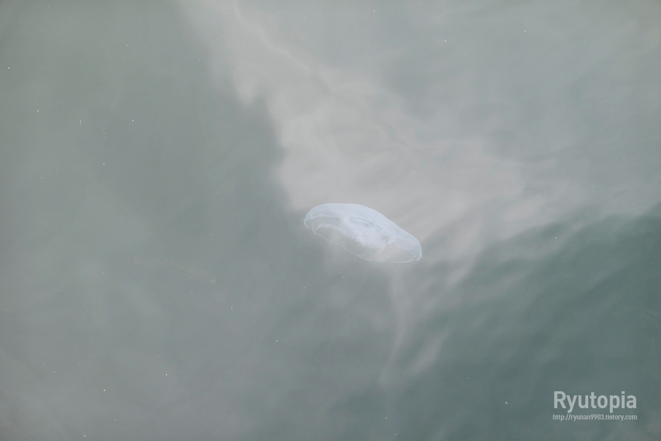 호수 위에 무언가 물고기는 아니고 떠다니는 부유물이 많아 확인해보니 해파리.