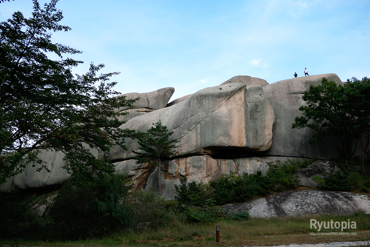 멀리서 바라본 '범바위' 의 모습. 바위 꼭대기에 사람이 있는데 계단을 따라 올라가면 저기까지 오를 수 있습니다.