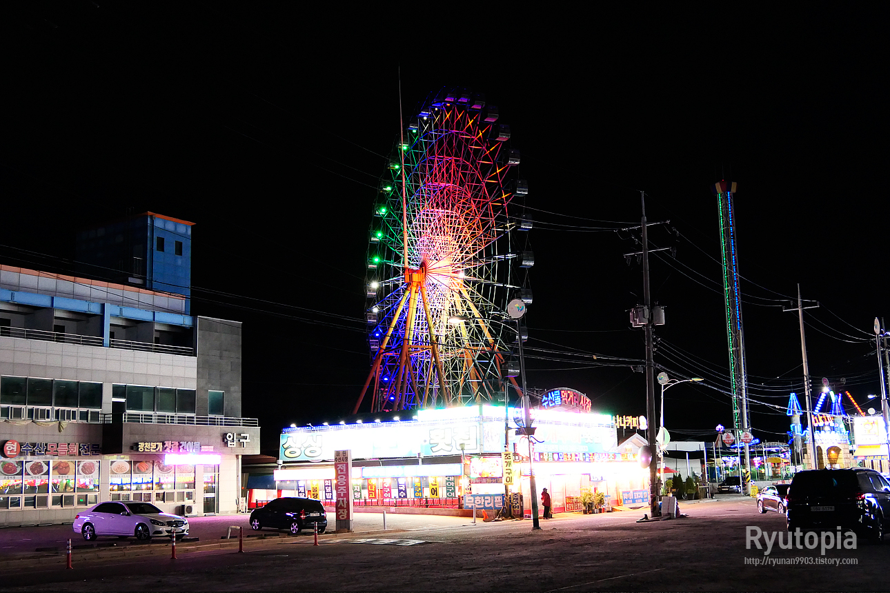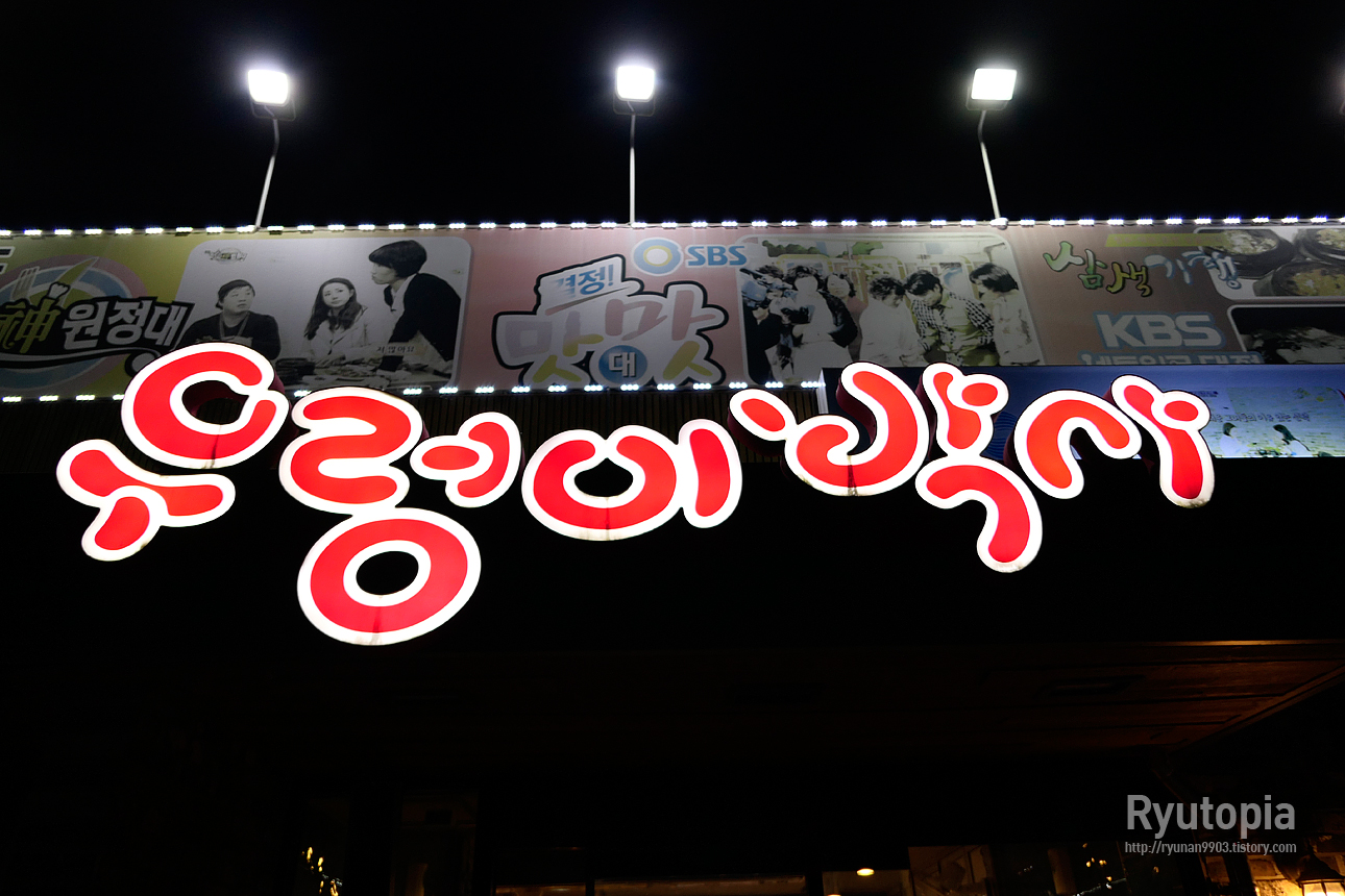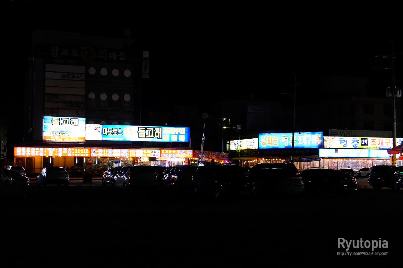 횟집이라든가 조개구이 집 간판이 엄청 화려하게 펼쳐져 있는 모습.