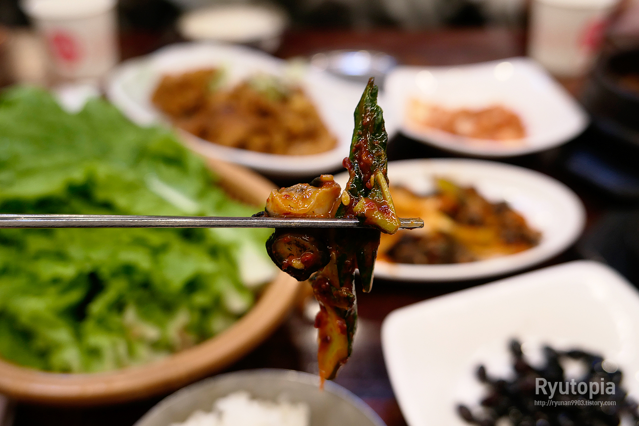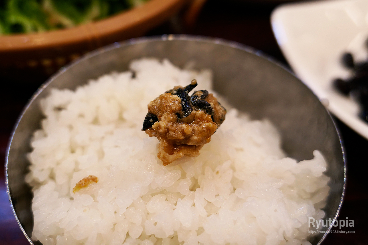 쌈장이 일반 고깃집 쌈장마냥 엄청 짜기만 한 게 아니라 상대적으로 덜 짜고 구수한 맛이라 듬뿍 얹어먹어도 괜찮습니다.