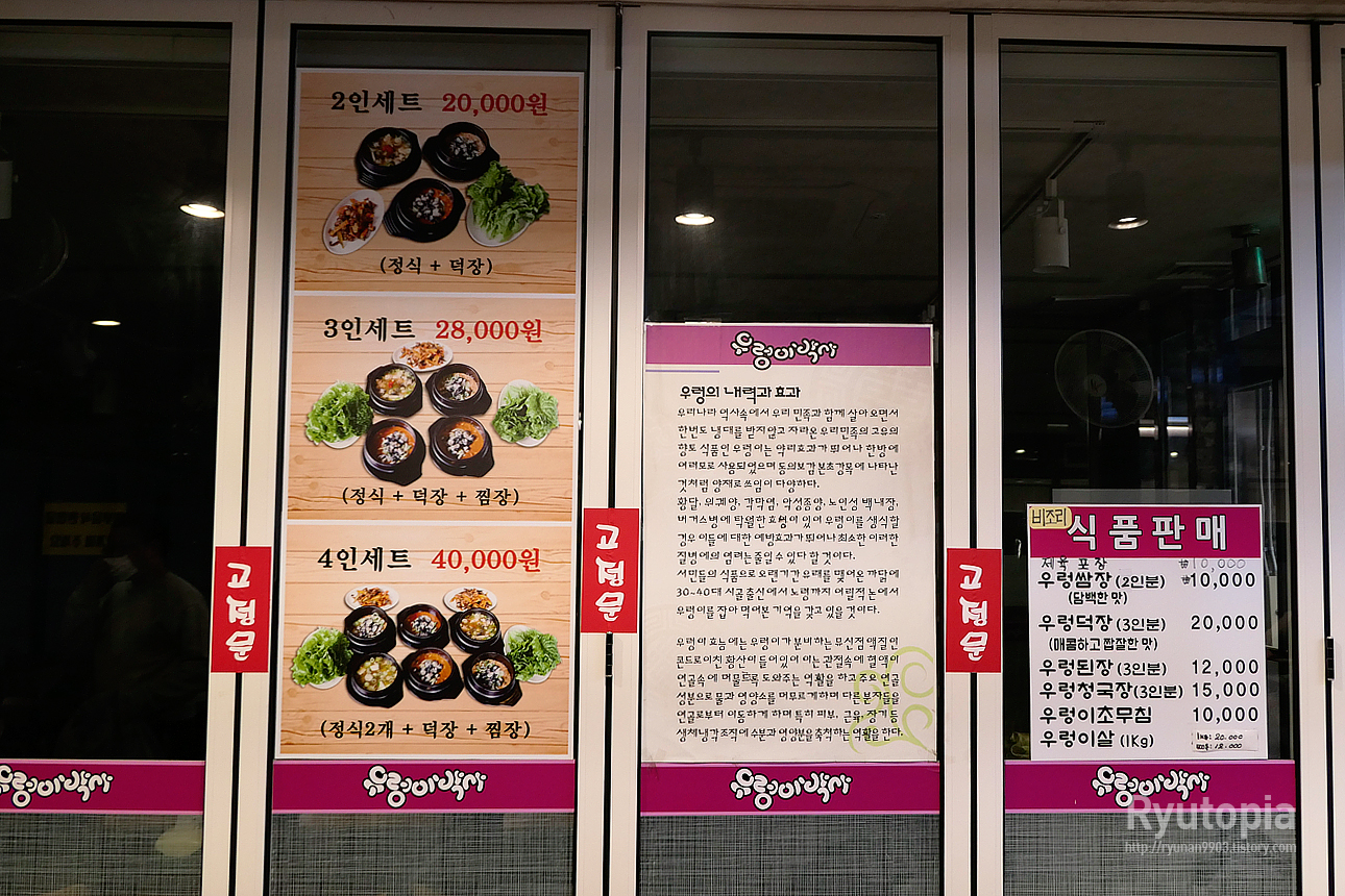 매장 들어가는 입구에 붙어있는 메뉴판 및 우렁이의 효과에 대한 안내.