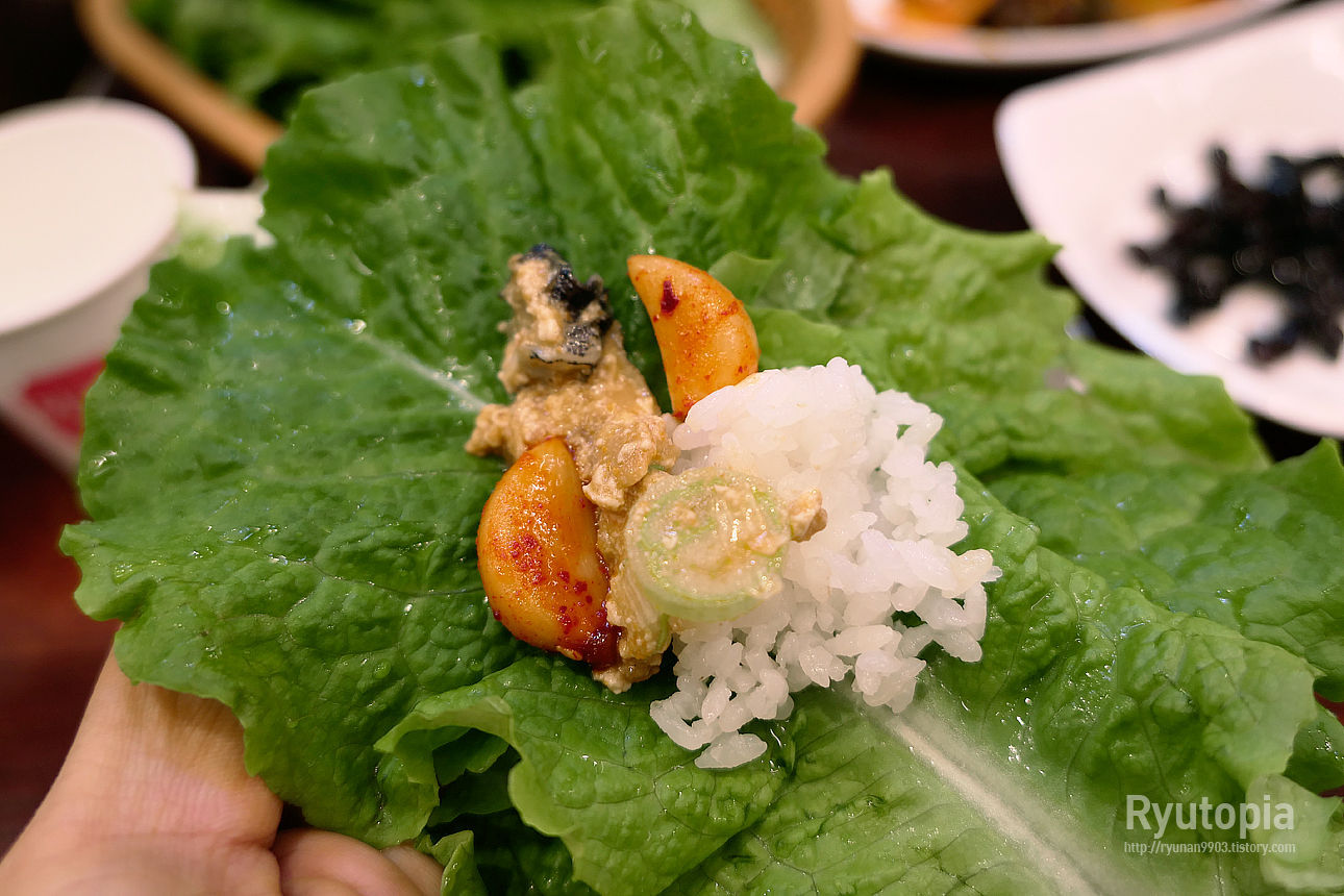 쌈 위에 마늘, 그리고 우렁쌈장과 밥을 듬뿍 올려 싸 먹으면 굳이 고기가 없어도 전혀 아쉽다는 생각이 들지 않습니다.