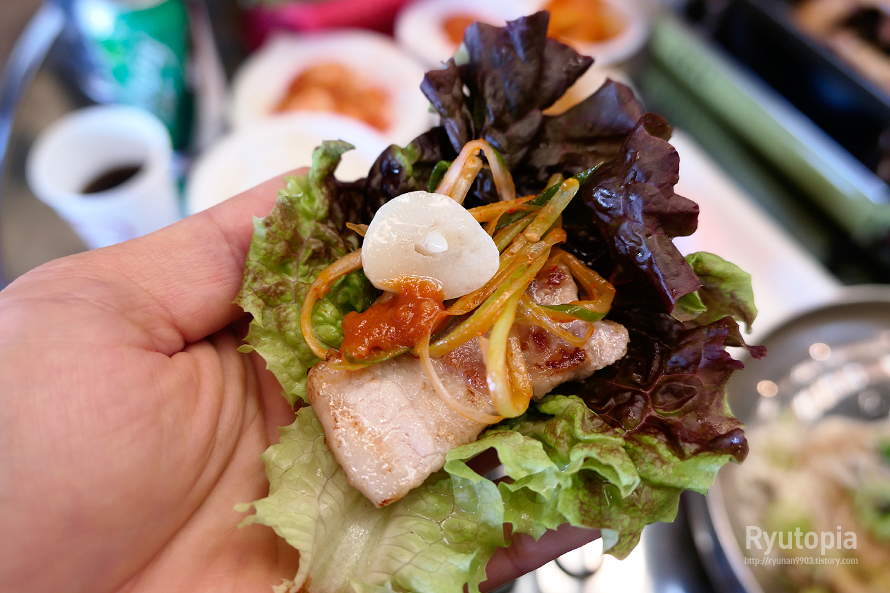역시 고기는 이렇게 쌈으로도 싸 먹어야...ㅋㅋ 구운 마늘과 함께!