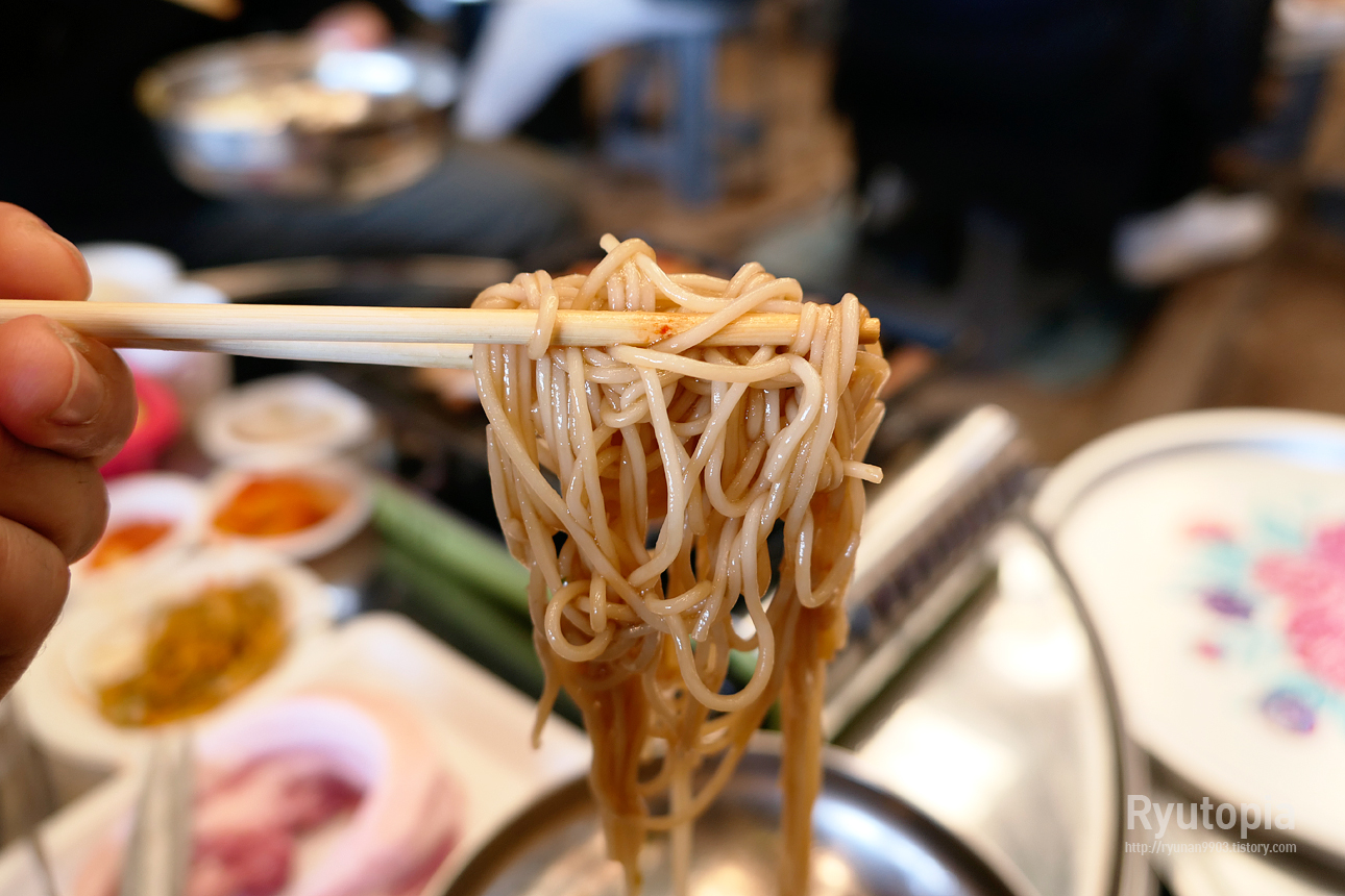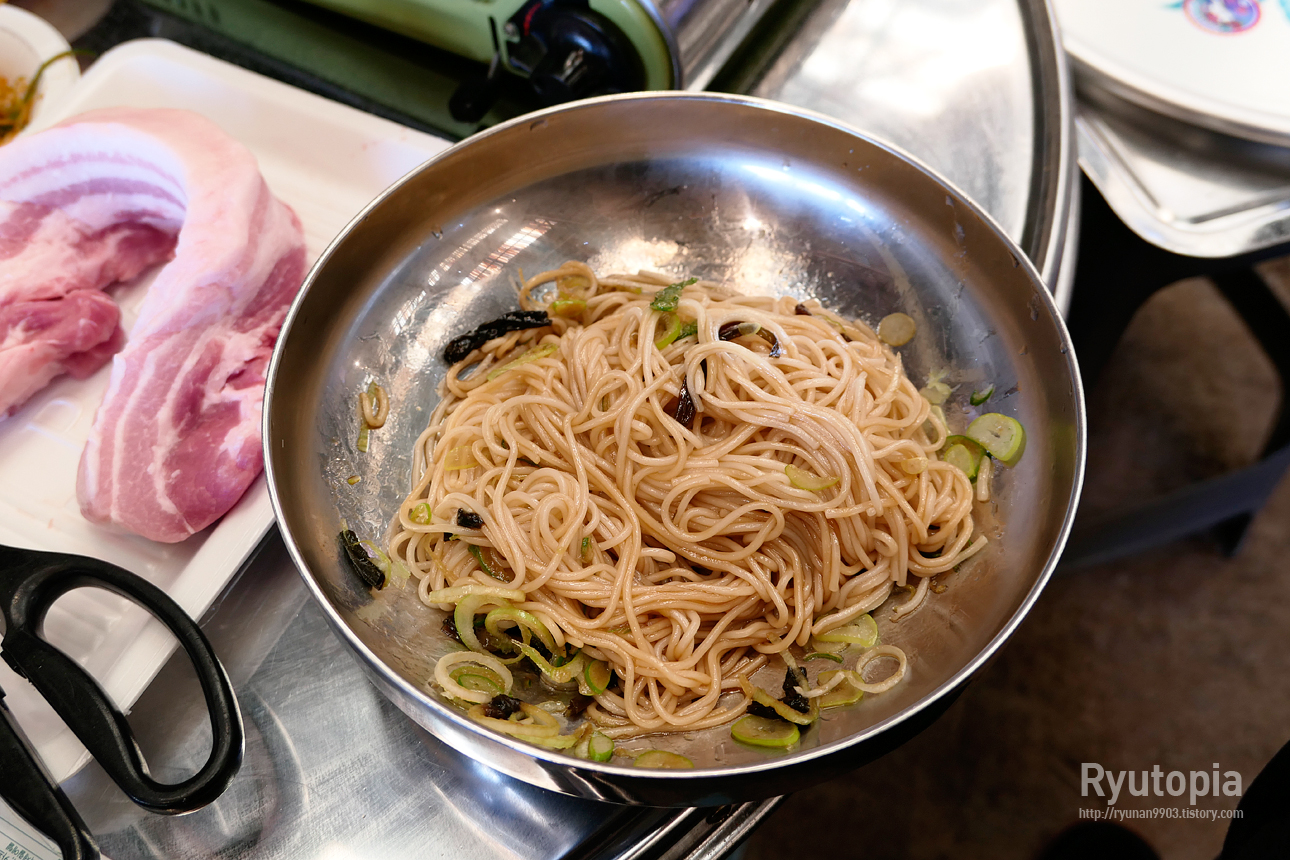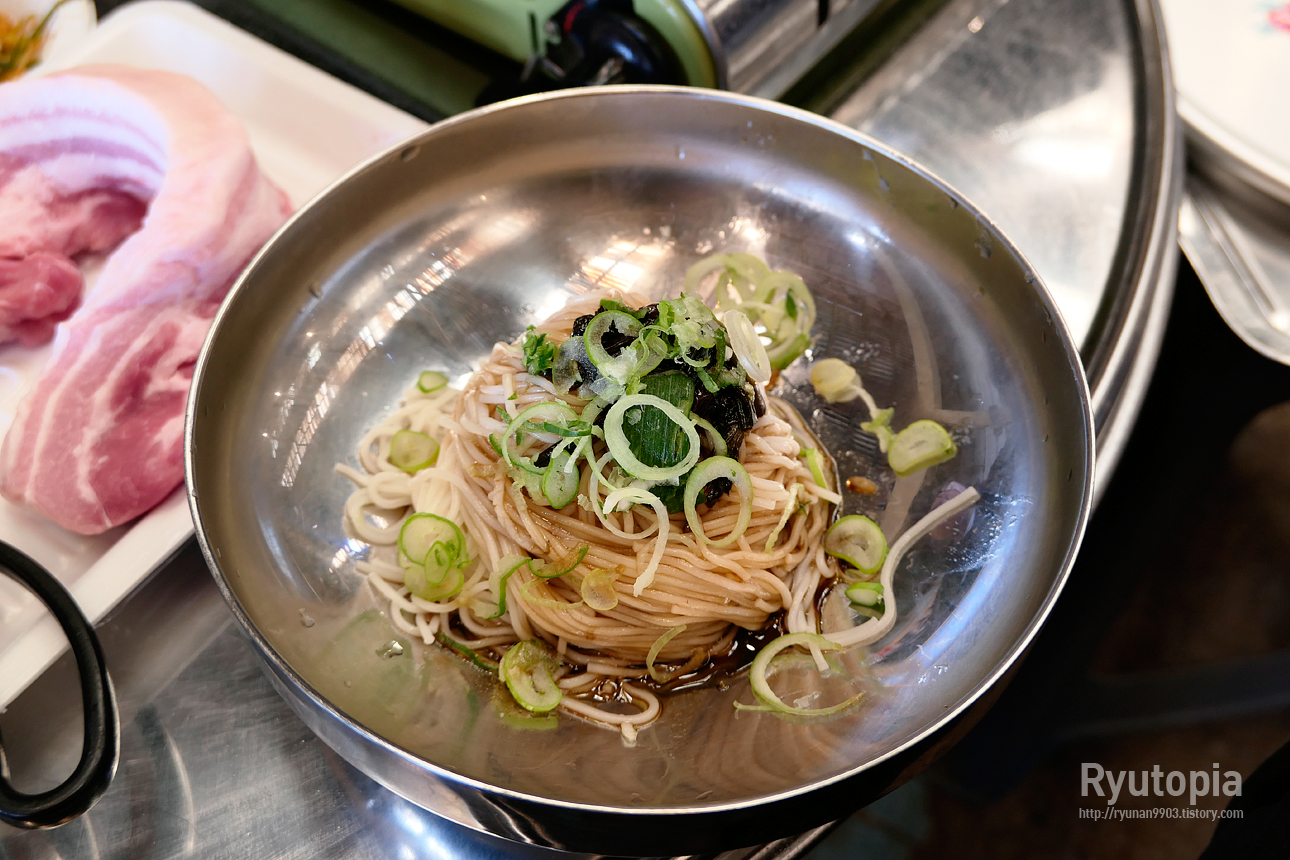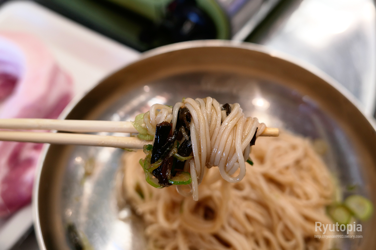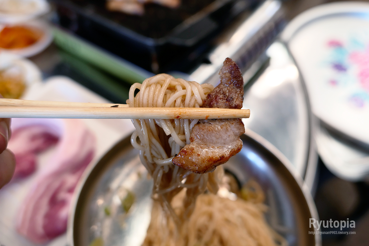 조금 심심한 맛이라고 느껴지던 국수가 삼겹살 구운 것과 결합하니 이제서야 완전체에 가까운 진한 맛으로 완성되는 느낌.