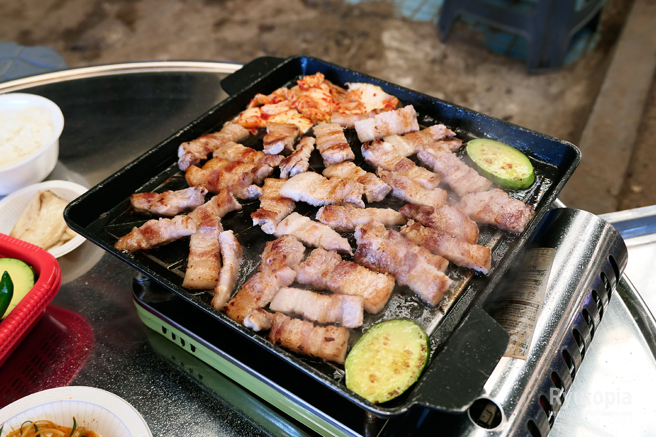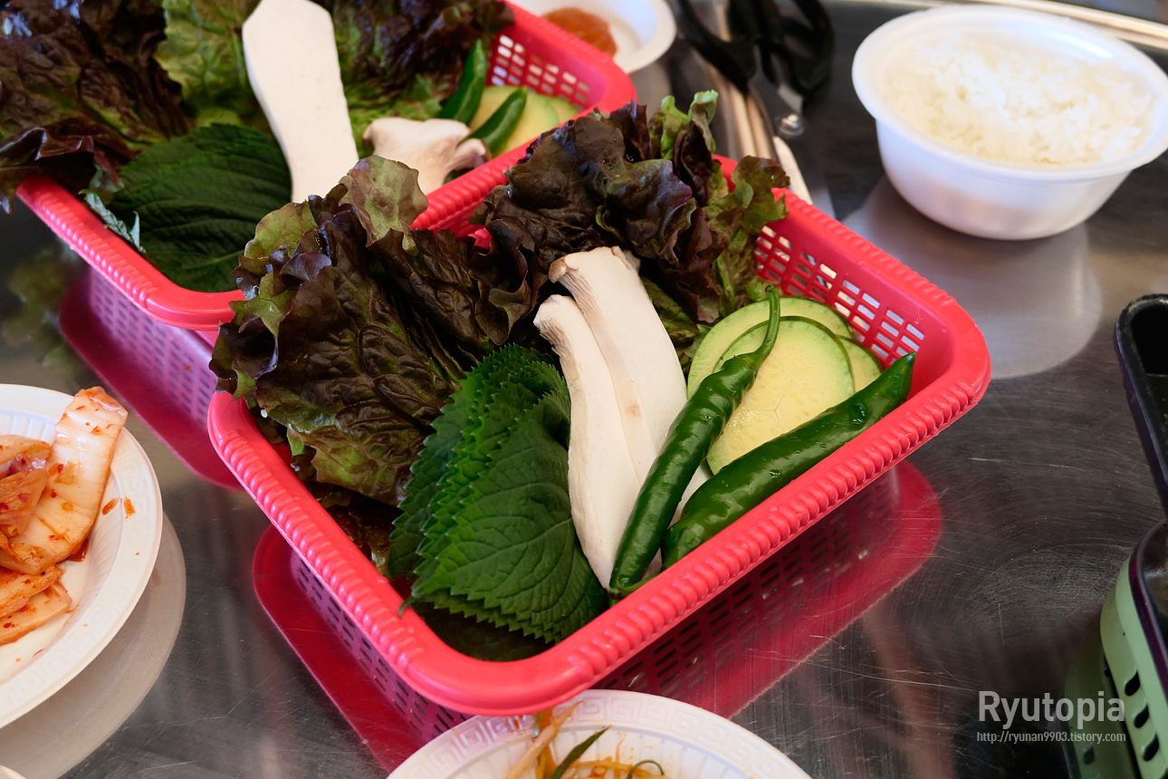 일종의 상차림비 대신 내는 곳이라고 보면 되지 않을까 싶어요. 말 그대로 고기불판, 그리고 각종 야채를 제공해줍니다.