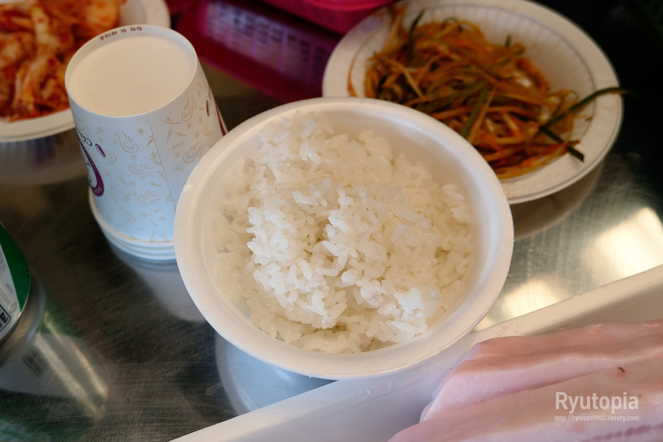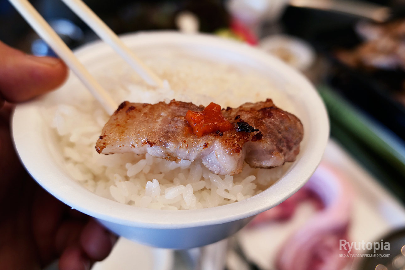 뜨거운 밥 위에 고기 한 점은 원래 삼겹살이 아닌 양념갈비여야 하지만... 그래도 이렇게 한 컷.