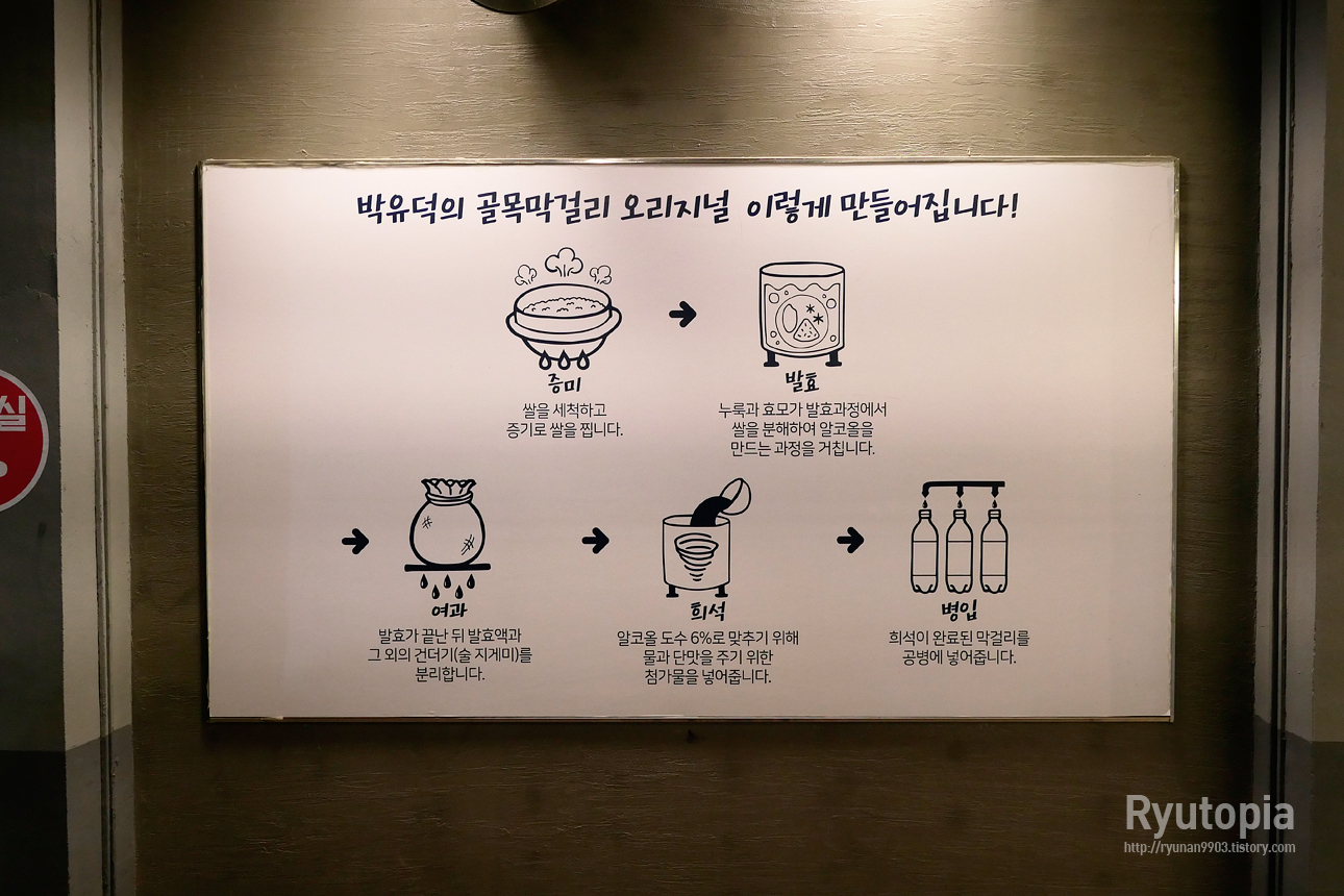 매장 담에 붙어있는 박유덕의 골목막걸리가 만들어지는 과정 안내.