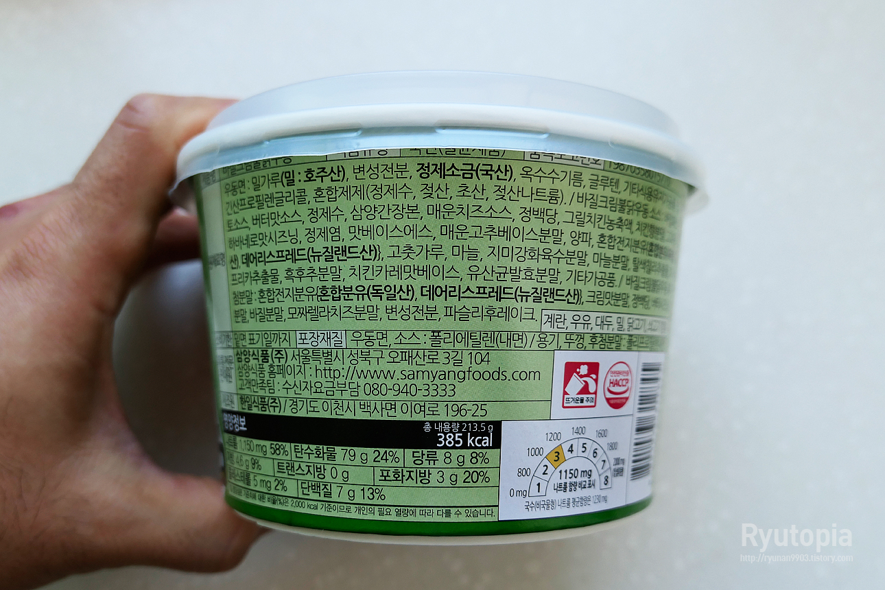 용기 하나(213.5g) 당 열량은 385kcal로 불닭볶음면 시리즈에 비해 열량은 현저히 낮은 편. 건면과 비슷한 수준이네요.