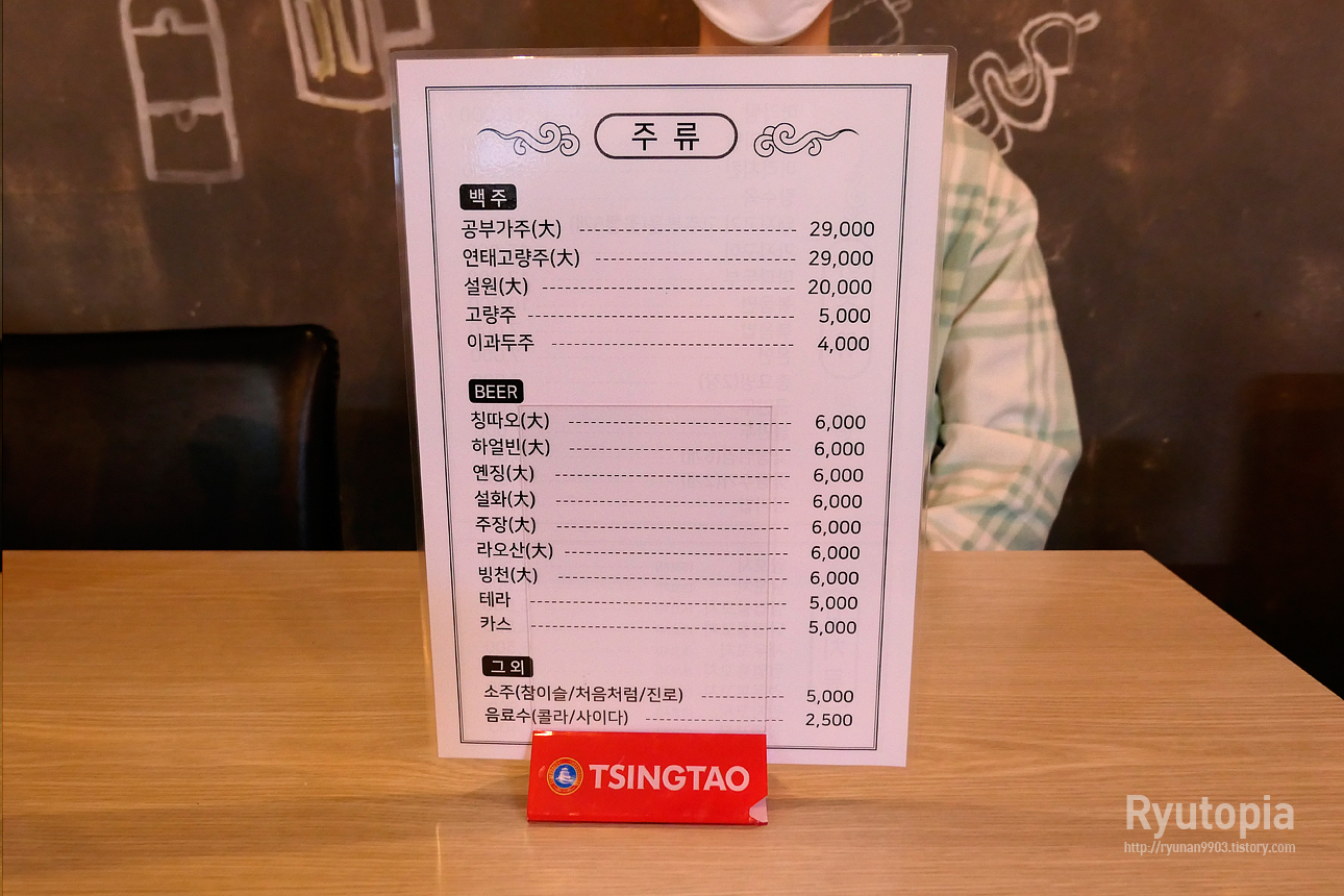 주류 메뉴. 다른 것보다도 중국 맥주가 전부 6,000원 균일가라는 게 진짜 마음에 드는 점.