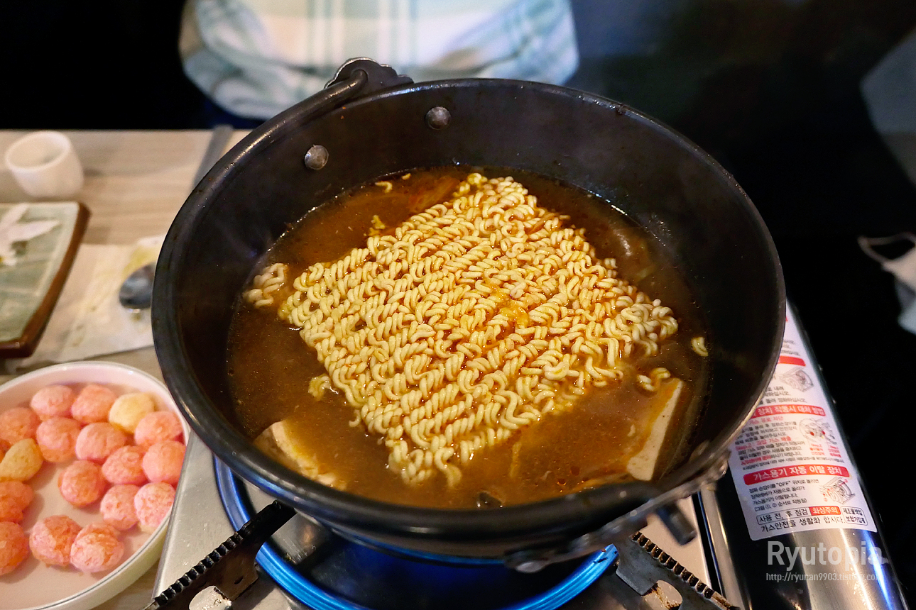 라면사리를 넣고 다시 한 번 팔팔 끓인 뒤 면과 남은 국물을 건져먹으며 마지막 마무리!