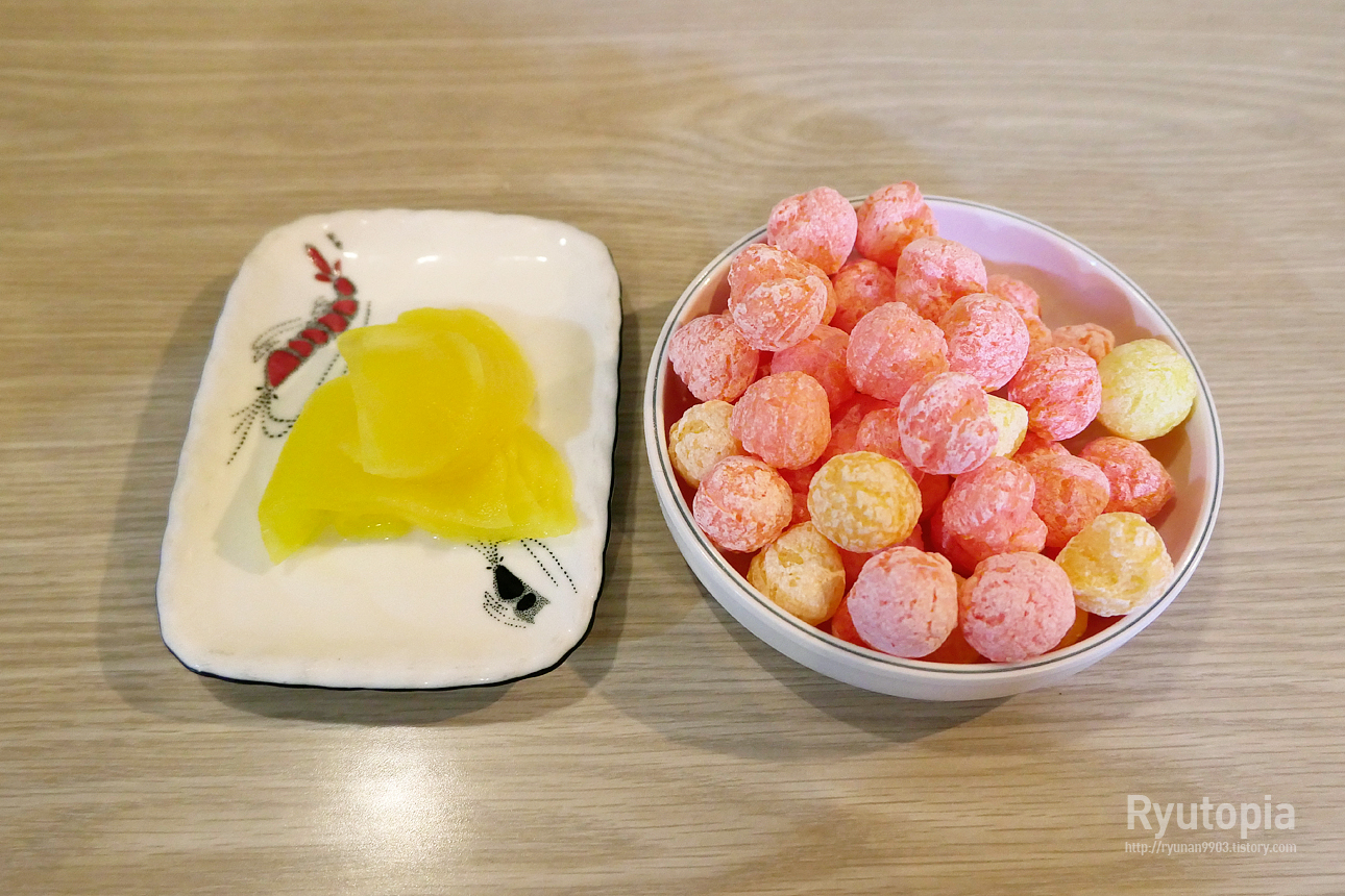 기본찬으로는 단무지 한 가지가 나오고 뻥튀기는 먹고 싶은 만큼 셀프로 직접 담아오면 됩니다.